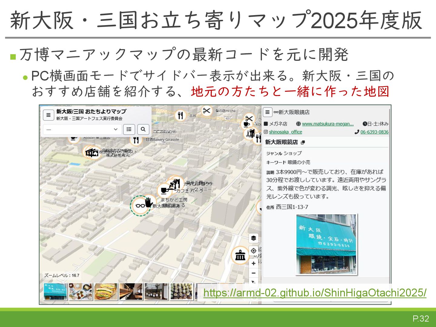 P.32 新大阪・三国お立ち寄りマップ2025年度版 ◼ 万博マニアックマップの最新コードを元に開発 ⚫ PC横画面モードでサイドバー表示が出来る。新大阪・三国の おすすめ店舗を紹介する、地元の方たちと一緒に作った地図 https://armd-02.github.io/ShinHigaOtachi2025/ P.32