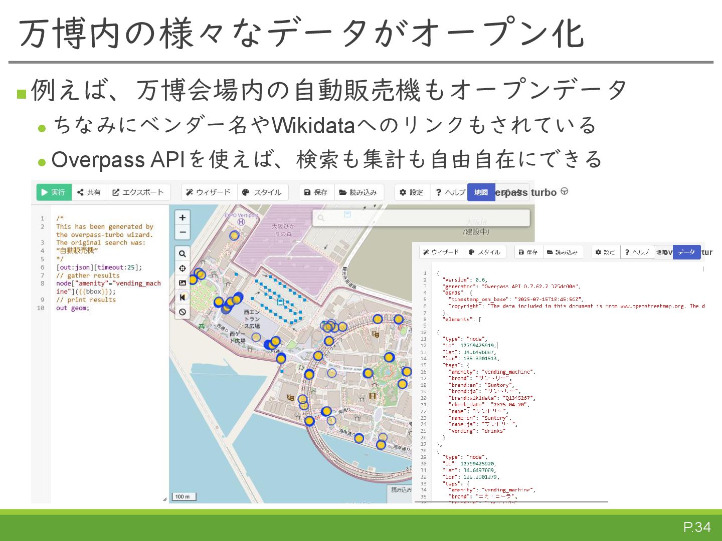 P.34 万博内の様々なデータがオープン化 ◼ 例えば、万博会場内の自動販売機もオープンデータ ⚫ ちなみにベンダー名やWikidataへのリンクもされている ⚫ Overpass APIを使えば、検索も集計も自由自在にできる P.34