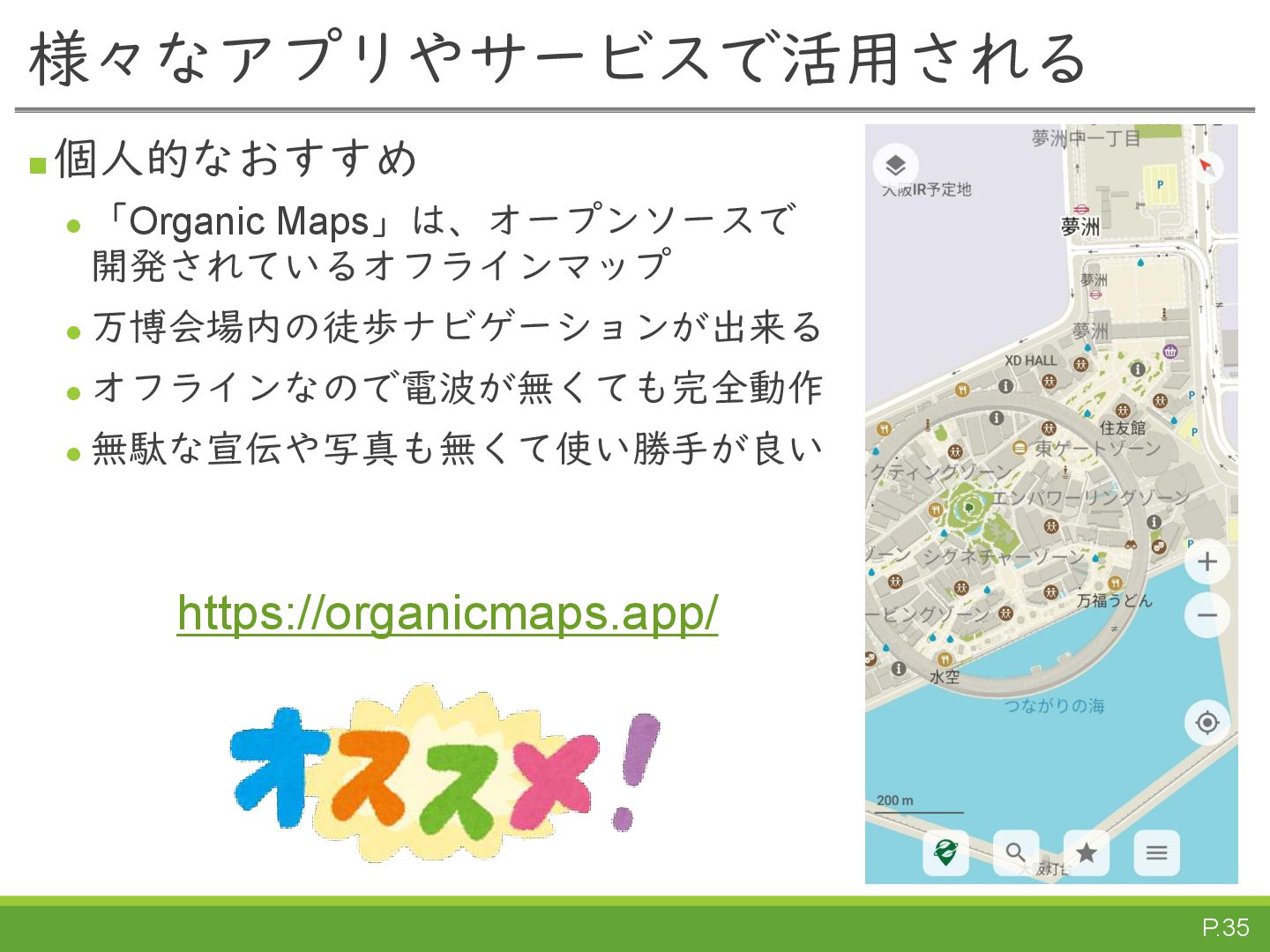 P.35 様々なアプリやサービスで活用される ◼ 個人的なおすすめ ⚫ 「Organic Maps」は、オープンソースで 開発されているオフラインマップ ⚫ 万博会場内の徒歩ナビゲーションが出来る