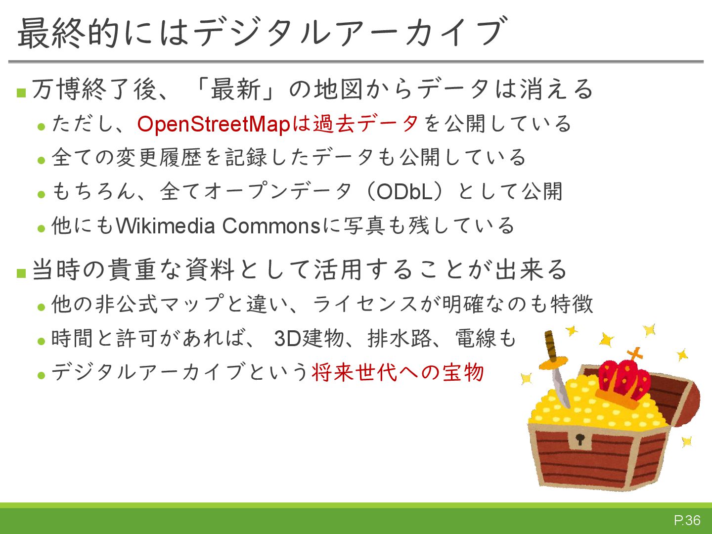 P.36 最終的にはデジタルアーカイブ ◼ 万博終了後、「最新」の地図からデータは消える ⚫ ただし、OpenStreetMapは過去データを公開している ⚫ 全ての変更履歴を記録したデータも公開している ⚫ もちろん、全てオープンデータ(ODbL)として公開