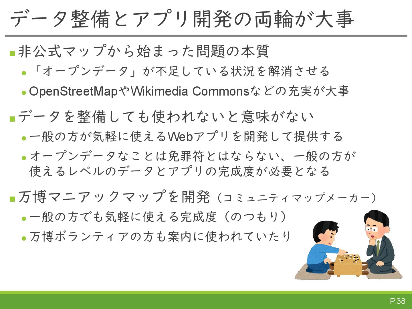 P.38 データ整備とアプリ開発の両輪が大事 ◼ 非公式マップから始まった問題の本質 ⚫ 「オープンデータ」が不足している状況を解消させる ⚫ OpenStreetMapやWikimedia Commonsなどの充実が大事 ◼