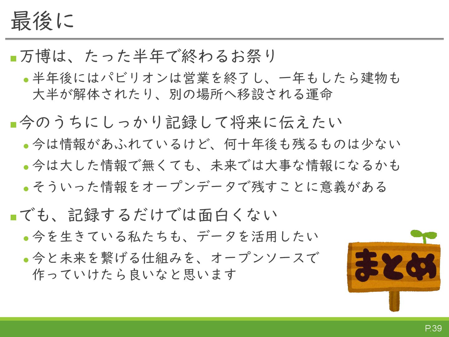 今は情報があふれているけど、何十年後も残るものは少ない ⚫ 今は大した情報で無くても、未来では大事な情報になるかも ⚫ そういった情報をオープンデータで残すことに意義がある ◼ でも、記録するだけでは面白くない ⚫ 今を生きている私たちも、データを活用したい ⚫ 今と未来を繋げる仕組みを、オープンソースで 作っていけたら良いなと思います P.39