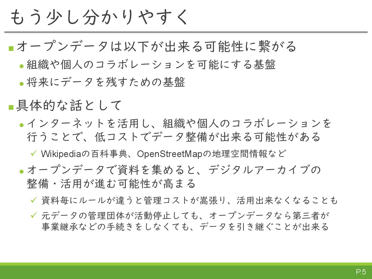 P.5 もう少し分かりやすく ◼ オープンデータは以下が出来る可能性に繋がる ⚫ 組織や個人のコラボレーションを可能にする基盤 ⚫ 将来にデータを残すための基盤 ◼ 具体的な話として