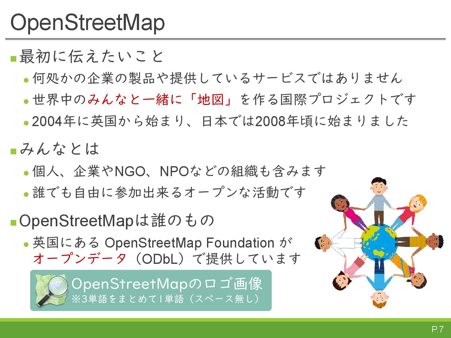 P.7 ◼ 最初に伝えたいこと ⚫ 何処かの企業の製品や提供しているサービスではありません ⚫ 世界中のみんなと一緒に「地図」を作る国際プロジェクトです ⚫ 2004年に英国から始まり、日本では2008年頃に始まりました ◼