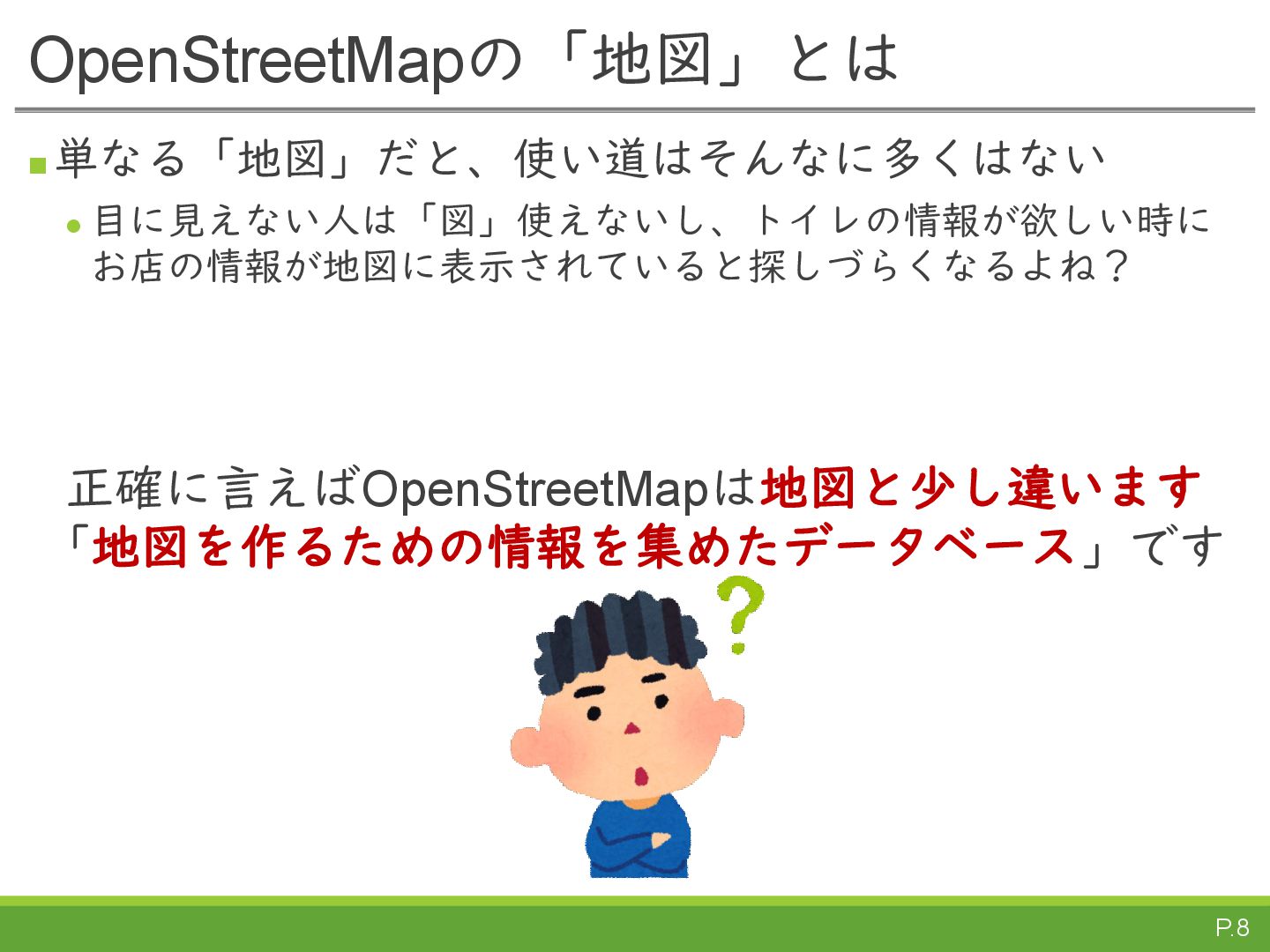みんなとは ⚫ 個人、企業やNGO、NPOなどの組織も含みます ⚫ 誰でも自由に参加出来るオープンな活動です ◼ OpenStreetMapは誰のもの ⚫ 英国にある OpenStreetMap Foundation が オープンデータ(ODbL)で提供しています OpenStreetMapのロゴ画像 ※3単語をまとめて1単語(スペース無し) OpenStreetMap P.7