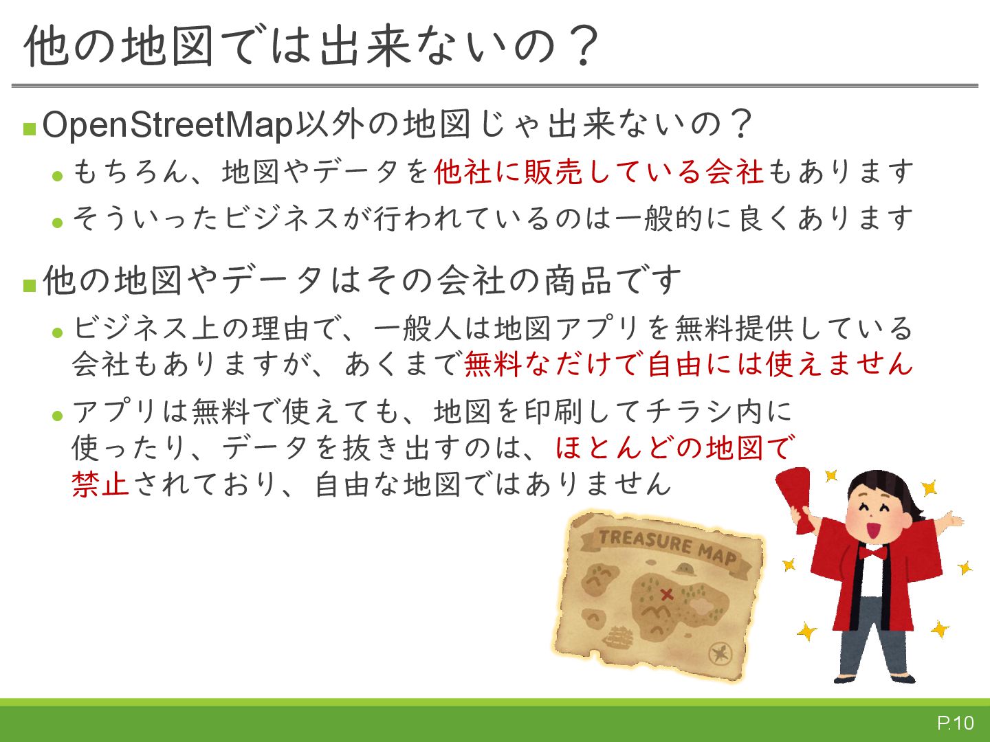 ⚫ ビジネス上の理由で、一般人は地図アプリを無料提供している 会社もありますが、あくまで無料なだけで自由には使えません ⚫ アプリは無料で使えても、地図を印刷してチラシ内に 使ったり、データを抜き出すのは、ほとんどの地図で 禁止されており、自由な地図ではありません P.10