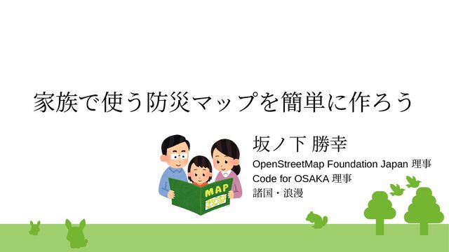 家族で使う防災マップを簡単に作ろう 坂ノ下 勝幸 OpenStreetMap Foundation Japan 理事 Code for OSAKA
