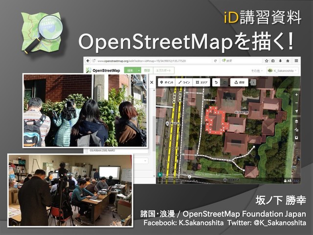 コンピュータが検索出来るようにする ◦ 種別(お店や公共施設、案内板など)は「タグ」で入力 ◦ 現地(看板など)に書かれた「正式名・固有名」を入力 ◦ 名前が見つからない時は、名前は入力しない(空欄) 名称指定のよくあるミス ◦ × コンビニ → 店種は shop タグで表現 ◦ × 駅前のローソン → 「駅前」の解説は不要 ◦ × 松本清 → 漢字にしない(マツモトキヨシ) ◦ × Family Mart → チェーン店はルール有(表記揺れ) ◦ × ローソン(Lawson) → 英語名は「多言語名称」から追加 P.17 描きたい場所へ移動 iDを起動する 地図を描いてみよう 地図をアップロード