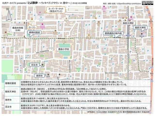 N 服部天神駅 豊島体育館 (会場) 豊島小学校 地図:諸国・浪漫 / ©OpenStreetMap contributors 穂積村囲堤 旧穂積村を洪水から守るために作られた堤。服部西町の東西約1km、南北0.8kmの範囲を方形に取り囲んでいた。 現在は堤周辺の土地がかさ上げされた結果、豊島体育館と服部駅の間で、堤があった時の面影がわずかに残っている。 服部天神宮 創建は寛和元年(985年)。主祭神は少彦名命と菅原道真。「足の神様」として知られている神社。 昌泰4年(901年)、菅原道真が九州の太宰府へ左遷で移動中、脚気で歩けなくなった。そこで、この地の秦氏が尊崇する医薬の祖神「少彦名命 (スクナビコナ)」の祠に祈願すると痛みが消えたとのこと。その後、花山天皇がこの祠に道真の霊を勧請したことで服部天神宮が創建したと伝えられる。 徳用寺 創建は延徳元年(1489年)。浄土真宗大谷派のお寺。 本願寺蓮如の布教に随行した藤井政重がこの寺を創建したと伝えられる。寺宝は南無阿弥陀仏の「六字名号」。蓮如の作と伝えられる。 忍法寺 創建は天文6年(1537年)。浄土真宗本願寺派のお寺。 本願寺證如に帰依した西岡與八がこの寺を創建したと伝えられる。門前に力石があり、穂積村出身の力士初岩が見事持ち上げた逸話がある。 ローソン スーパーマーケット (阪急オアシス) 穂積村囲堤 参考資料:『とよなか歴史・文化財ガイドブック』 豊中市教育委員会発行 平成20年 穂積遺跡の案内板