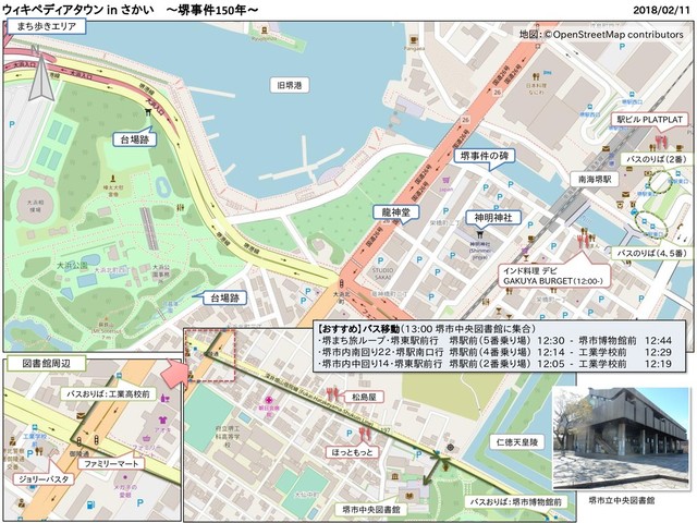 地図:©OpenStreetMap contributors ウィキペディアタウン in さかい ~堺事件150年~ 2018/02/11 堺事件の碑 神明神社 台場跡