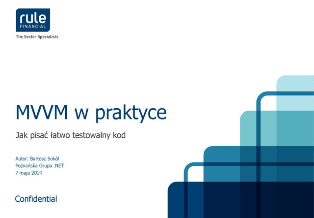do realiów aplikacji .NET z interfejsem definiowanym deklaratywnie w XAML-u Jasna separacja warstw aplikacji i komunikacja pomiędzy nimi Sprzyja pisaniu testowalnego kodu