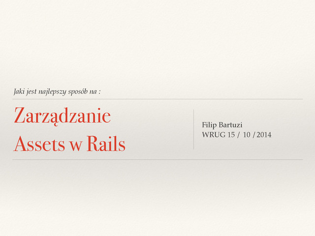 w sprockets).! + Wszystko w jednym pliku Gemfile.! + Łatwo i szybko.! ! Przeciw:! - Zwykle nie są aktualne.! - Wersja gema != wersja biblioteki.! - Czasochłonne dla opiekuna Gema.! - Każdy Gem opakowuje bibliotekę inaczej.!