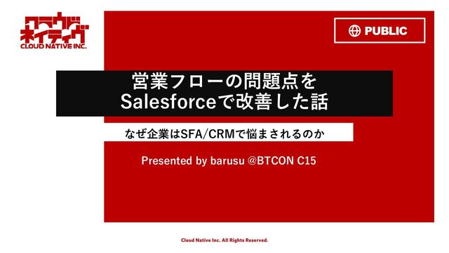 0 PUBLIC 営業フローの問題点を Salesforceで改善した話 なぜ企業はSFA/CRMで悩まされるのか Presented by barusu @BTCON C15