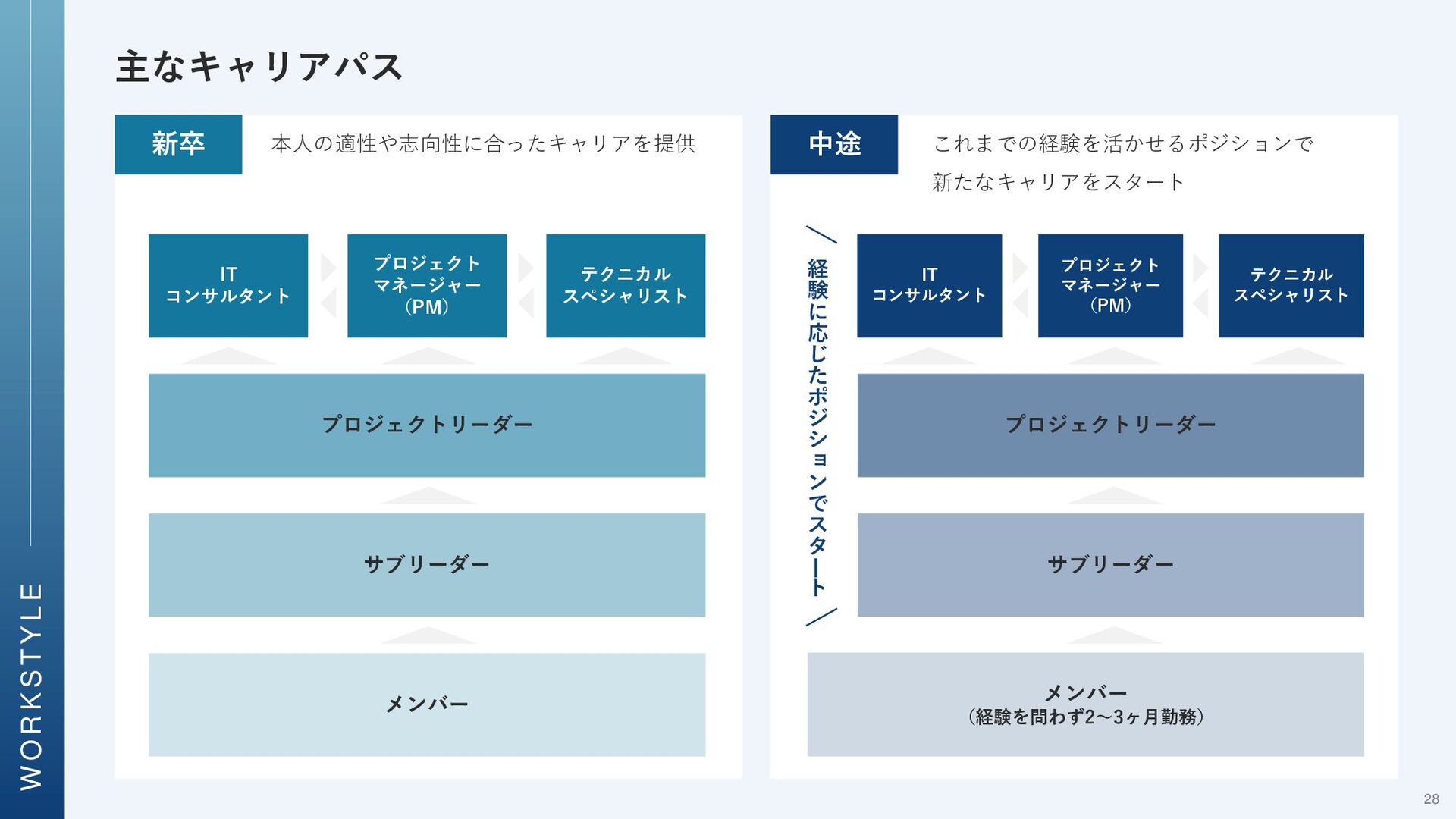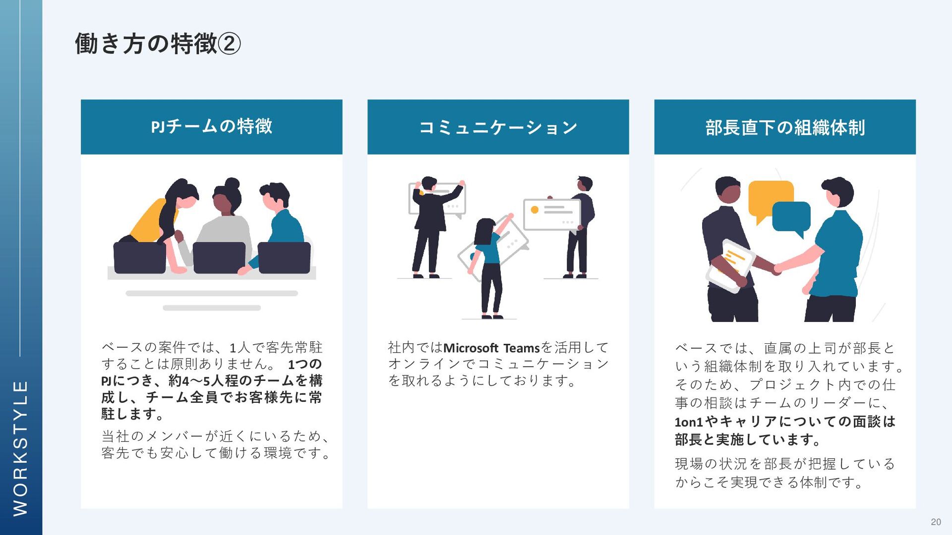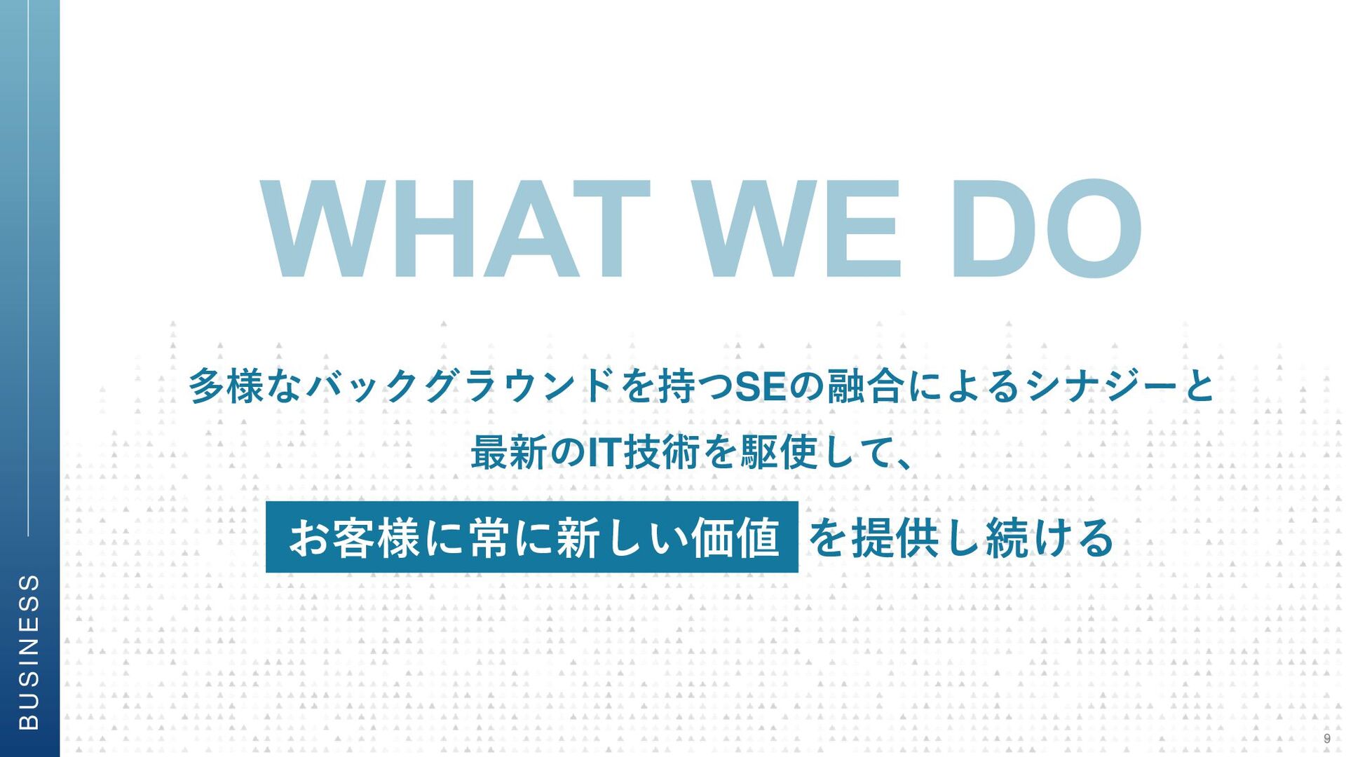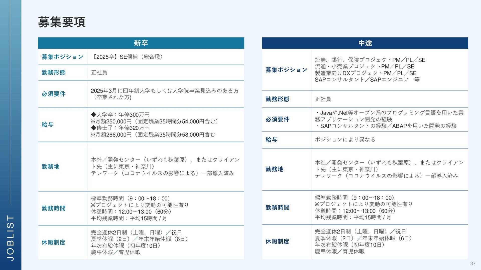 募集ポジション 【2025卒】SE候補(総合職) 勤務形態 正社員 必須要件 2025年3月に四年制大学もしくは大学院卒業見込みのある方 (卒業された方) 給与 ◆大学卒:年俸300万円 ※月額250,000円(固定残業35時間分54,000円含む) ◆修士了:年俸320万円 ※月額266,000円(固定残業35時間分58,000円含む 勤務地 本社/開発センター(いずれも秋葉原)、またはクライアン ト先(主に東京・神奈川) テレワーク(コロナウイルスの影響による)一部導入済み 勤務時間 標準勤務時間(9:00~18:00) ※プロジェクトにより変動の可能性有り 休憩時間:12:00~13:00(60分) 平均残業時間:平均15時間 / 月 休暇制度 完全週休2日制(土曜、日曜)/祝日 夏季休暇(2日)/年末年始休暇(6日) 年次有給休暇(初年度10日) 慶弔休暇/育児休暇 中途 募集ポジション 証券、銀行、保険プロジェクトPM/PL/SE 流通・小売業プロジェクトPM/PL/SE 製造業向けDXプロジェクトPM/PL/SE SAPコンサルタント/SAPエンジニア 等 勤務形態 正社員 必須要件 ・Javaや.Net等オープン系のプログラミング言語を用いた業 務アプリケーション開発の経験 ・SAPコンサルタントの経験/ABAPを用いた開発の経験 給与 ポジションにより異なる 勤務地 本社/開発センター(いずれも秋葉原)、またはクライアン ト先(主に東京・神奈川) テレワーク(コロナウイルスの影響による)一部導入済み 勤務時間 標準勤務時間(9:00~18:00) ※プロジェクトにより変動の可能性有り 休憩時間:12:00~13:00(60分) 平均残業時間:平均15時間 / 月 休暇制度 完全週休2日制(土曜、日曜)/祝日 夏季休暇(2日)/年末年始休暇(6日) 年次有給休暇(初年度10日) 慶弔休暇/育児休暇