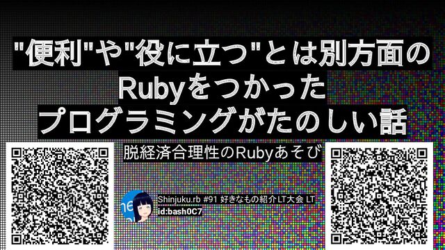 "便利"や"役に立つ"とは別方面の Rubyをつかった プログラミングがたのしい話 脱経済合理性のRubyあそび Shinjuku.rb #91 好きなもの紹介LT大会 LT id:bash0C7