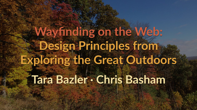 Inspired by adventuring in the great outdoors, we will explore principles, practices, and patterns that can guide those designing a web navigation experience. How do we design for users wanting to browse content or just wanting to efficiently accomplish a given task? How does context, such as resource constraints, prior knowledge, knowledge acquisition, and personal experience affect how a user traverses an interface? How can navigational experiences adapt for context?