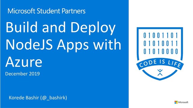 ExpressJS for routing and tunneling • And EJS is used in writing the layout and functionalities AZURE PORTAL | Sign in to your Azure Portal • Create an Azure account, if you’re yet to get one • Azure for Students gets you free $200 in cloud credits CREATE | Create the web app service on Azure • We’ll be getting the Web Apps service from the Azure Marketplace • Then get setup with the Node.js runtime on Microsoft Azure DEPLOY | Choose a deployment option and push code to web app service • We’ll choose a deployment option and push our code using Git • We’ll also be getting Git clone URL from the Azure Development Center TEST | Checkout the work of our NodeJS app against bugs and deployment bottlenecks Agenda