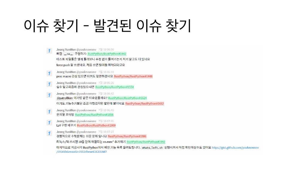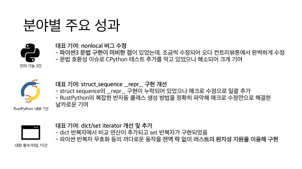 문법 구현이 미비한 점이 있었는데, 조금씩 수정되어 오다 컨트리뷰톤에서 완벽하게 수정 - 문법 호환성 이슈로 CPython 테스트 추가를 막고 있었으나 해소되어 크게 기여 언어 기능 3건 RustPython 내부 7건 대표 기여: struct_sequence __repr__ 구현 개선 - struct sequence의 __repr__ 구현이 누락되어 있었으나 매크로 수정으로 일괄 추가 - RustPython의 복잡한 반자동 클래스 생성 방법을 정확히 파악해 매크로 수정만으로 해결한 날카로운 기여 내장 함수/타입 15건 대표 기여: dict/set iterator 개선 및 추가 - dict 반복자에서 비교 연산이 추가되고 set 반복자가 구현되었음 - 파이썬 반복자 무효화 등의 까다로운 동작을 전역 락 없이 러스트의 원자성 지원을 이용해 구현