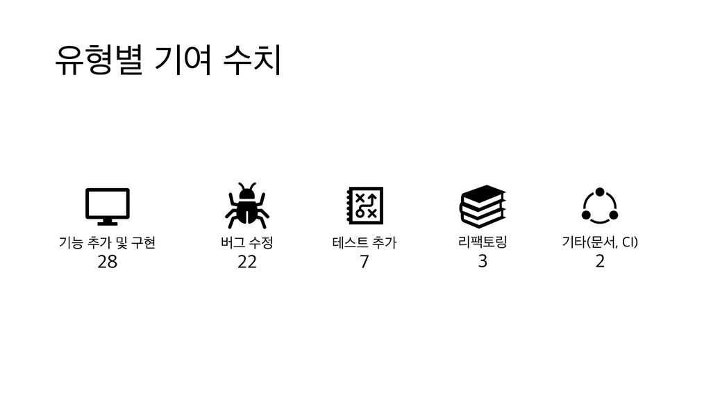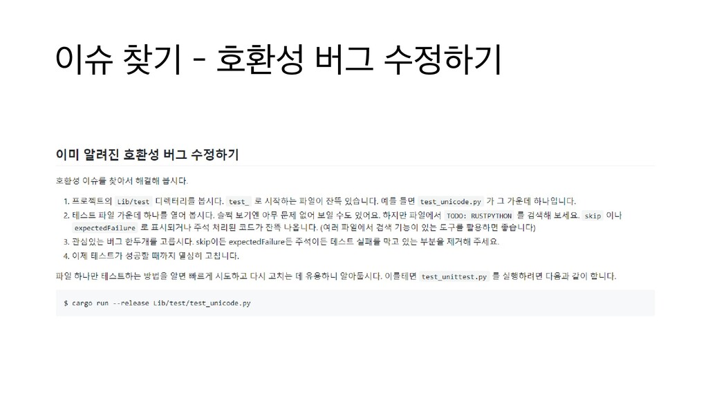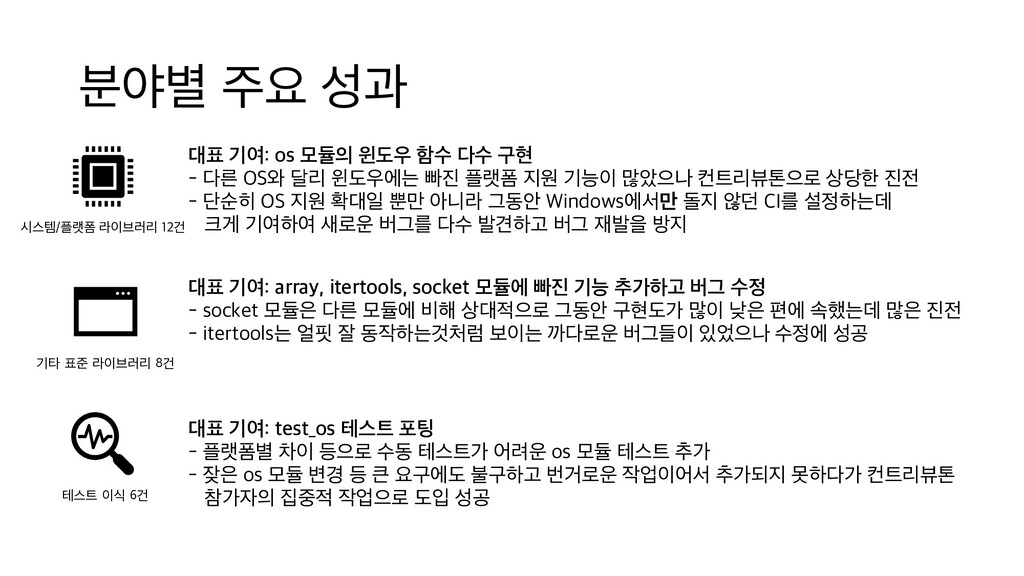 구현 - 다른 OS와 달리 윈도우에는 빠진 플랫폼 지원 기능이 많았으나 컨트리뷰톤으로 상당한 진전 - 단순히 OS 지원 확대일 뿐만 아니라 그동안 Windows에서만 돌지 않던 CI를 설정하는데 크게 기여하여 새로운 버그를 다수 발견하고 버그 재발을 방지 시스템/플랫폼 라이브러리 12건 기타 표준 라이브러리 8건 대표 기여: array, itertools, socket 모듈에 빠진 기능 추가하고 버그 수정 - socket 모듈은 다른 모듈에 비해 상대적으로 그동안 구현도가 많이 낮은 편에 속했는데 많은 진전 - itertools는 얼핏 잘 동작하는것처럼 보이는 까다로운 버그들이 있었으나 수정에 성공 테스트 이식 6건 대표 기여: test_os 테스트 포팅 - 플랫폼별 차이 등으로 수동 테스트가 어려운 os 모듈 테스트 추가 - 잦은 os 모듈 변경 등 큰 요구에도 불구하고 번거로운 작업이어서 추가되지 못하다가 컨트리뷰톤 참가자의 집중적 작업으로 도입 성공