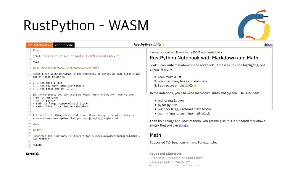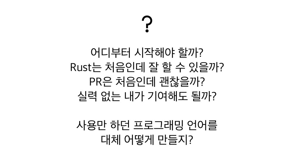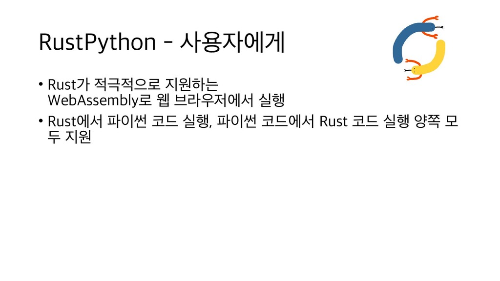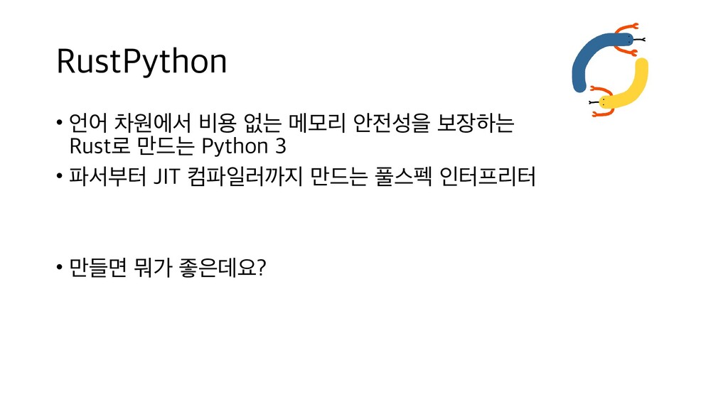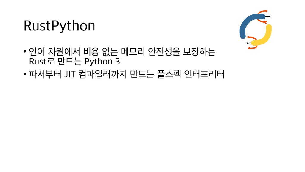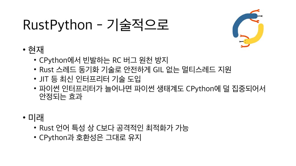 원천 방지 • Rust 스레드 동기화 기술로 안전하게 GIL 없는 멀티스레드 지원 • JIT 등 최신 인터프리터 기술 도입 • 파이썬 인터프리터가 늘어나면 파이썬 생태계도 CPython에 덜 집중되어서 안정되는 효과 • 미래 • Rust 언어 특성 상 C보다 공격적인 최적화가 가능 • CPython과 호환성은 그대로 유지