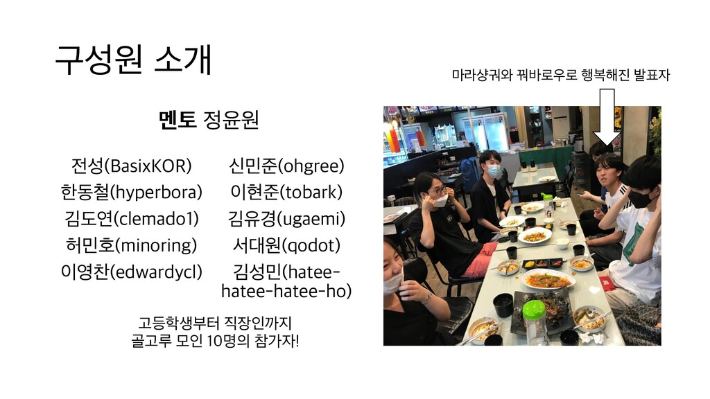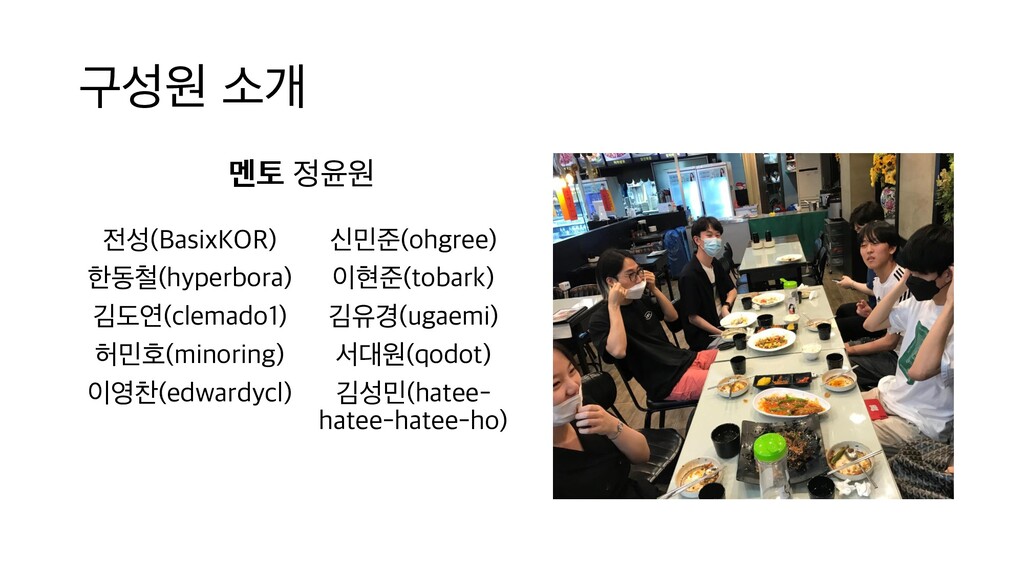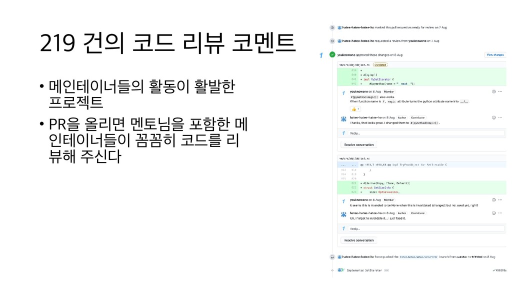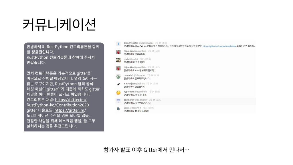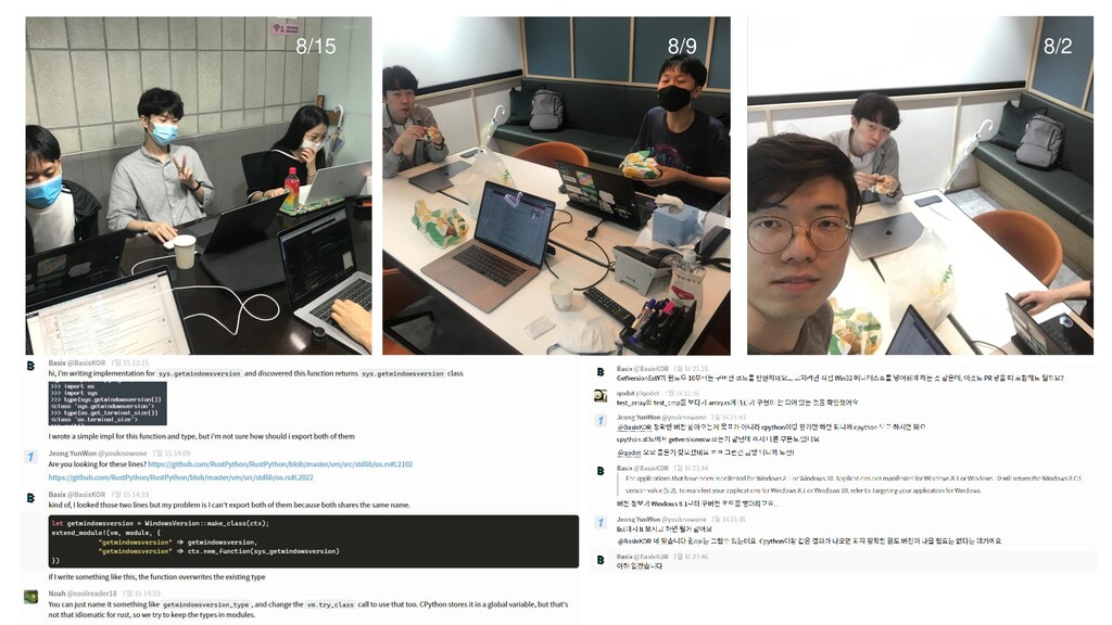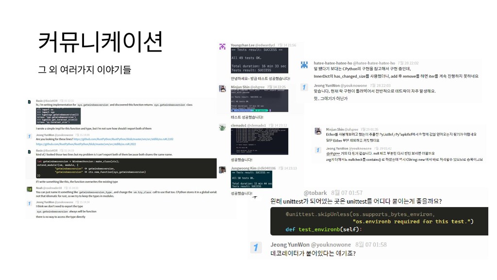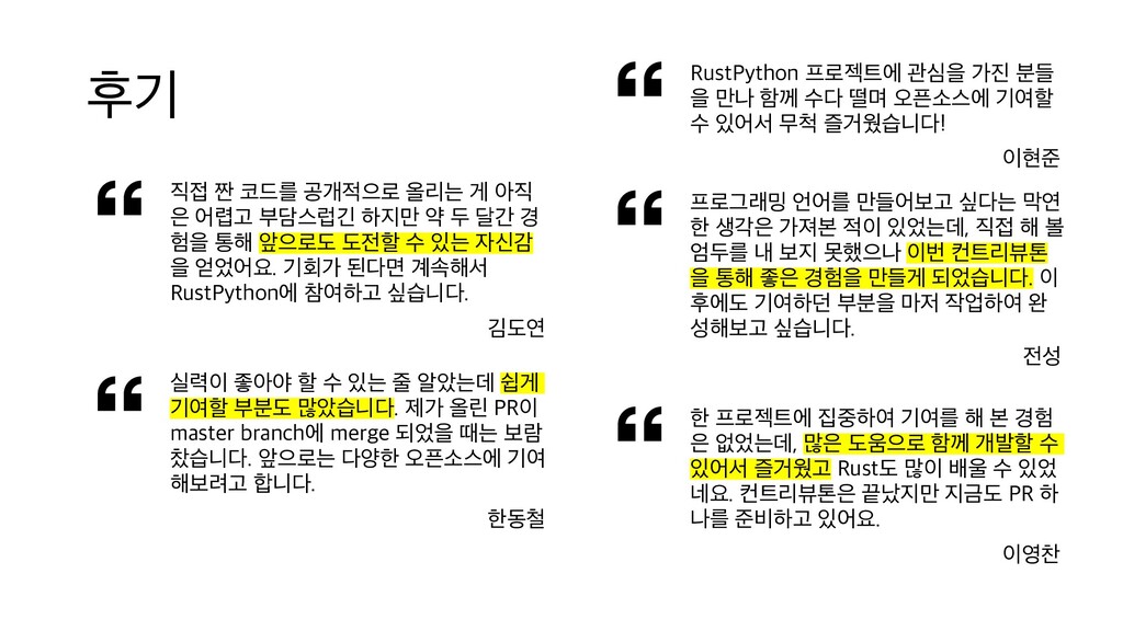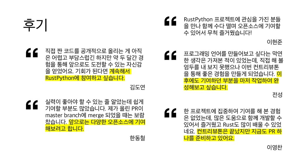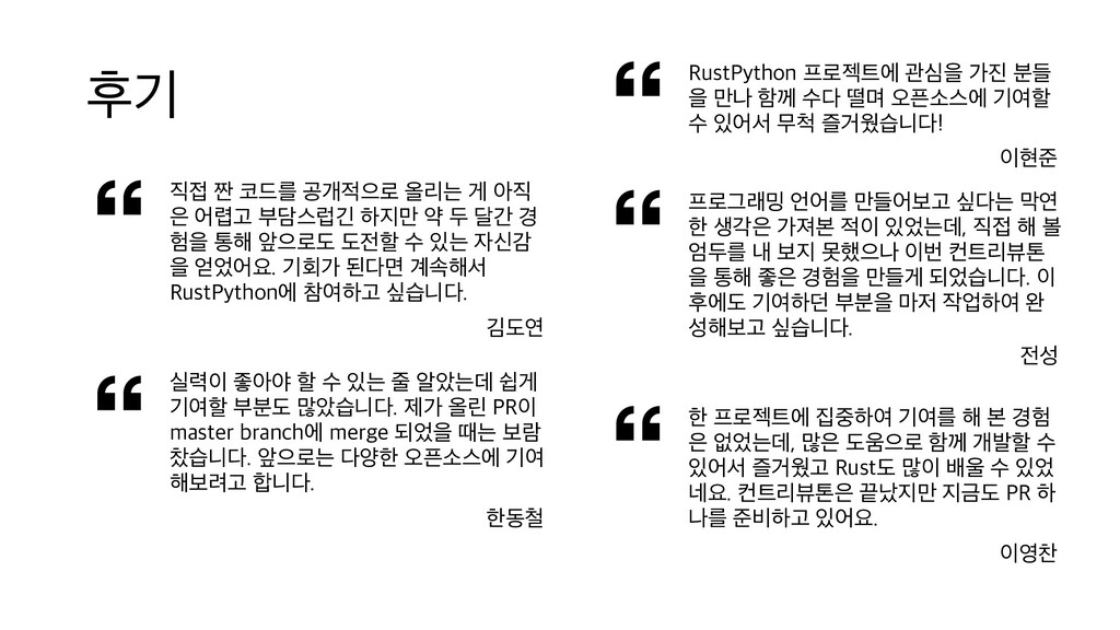 부담스럽긴 하지만 약 두 달간 경 험을 통해 앞으로도 도전할 수 있는 자신감 을 얻었어요. 기회가 된다면 계속해서 RustPython에 참여하고 싶습니다. 김도연 실력이 좋아야 할 수 있는 줄 알았는데 쉽게 기여할 부분도 많았습니다. 제가 올린 PR이 master branch에 merge 되었을 때는 보람 찼습니다. 앞으로는 다양한 오픈소스에 기여 해보려고 합니다. 한동철 프로그래밍 언어를 만들어보고 싶다는 막연 한 생각은 가져본 적이 있었는데, 직접 해 볼 엄두를 내 보지 못했으나 이번 컨트리뷰톤 을 통해 좋은 경험을 만들게 되었습니다. 이 후에도 기여하던 부분을 마저 작업하여 완 성해보고 싶습니다. 전성 한 프로젝트에 집중하여 기여를 해 본 경험 은 없었는데, 많은 도움으로 함께 개발할 수 있어서 즐거웠고 Rust도 많이 배울 수 있었 네요. 컨트리뷰톤은 끝났지만 지금도 PR 하 나를 준비하고 있어요. 이영찬 RustPython 프로젝트에 관심을 가진 분들 을 만나 함께 수다 떨며 오픈소스에 기여할 수 있어서 무척 즐거웠습니다! 이현준