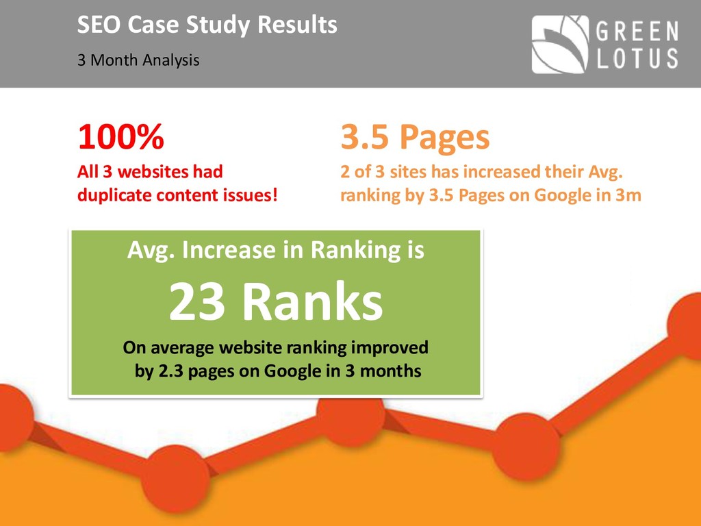 of 3 sites has increased their Avg. ranking by 3.5 Pages on Google in 3m 100% All 3 websites had duplicate content issues! Avg. Increase in Ranking is 23 Ranks On average website ranking improved by 2.3 pages on Google in 3 months