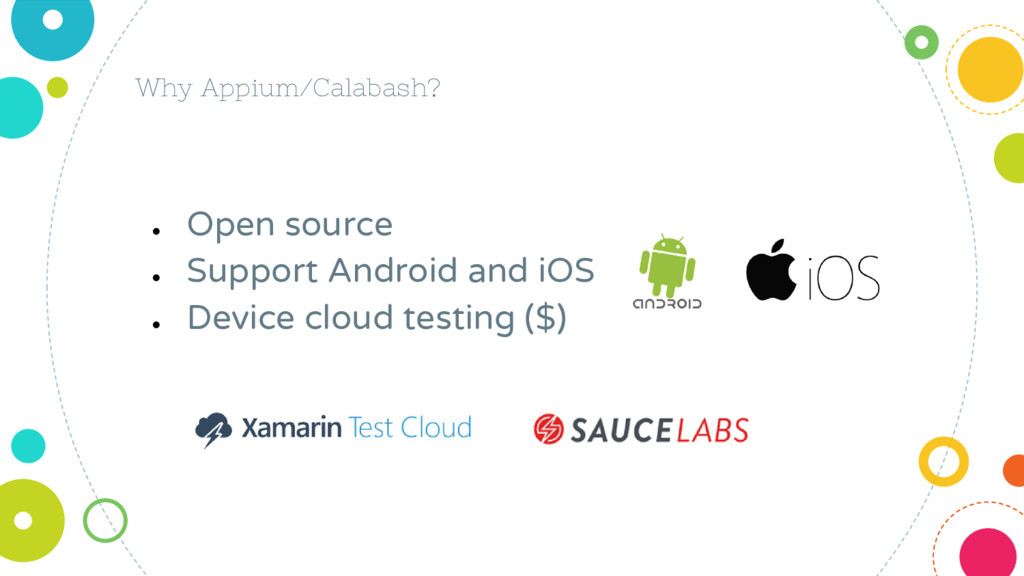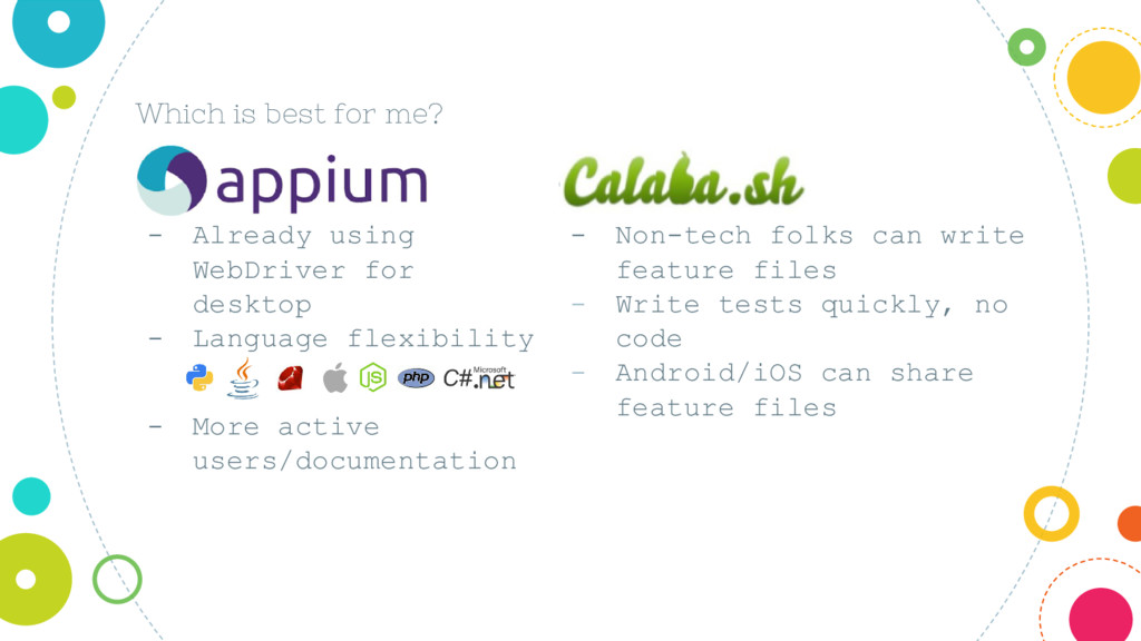 - More active users/documentation Which is best for me? Calabash - Non-tech folks can write feature files - Write tests quickly, no code - Android/iOS can share feature files