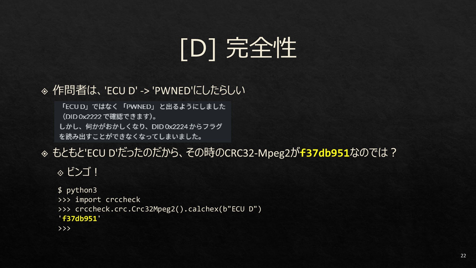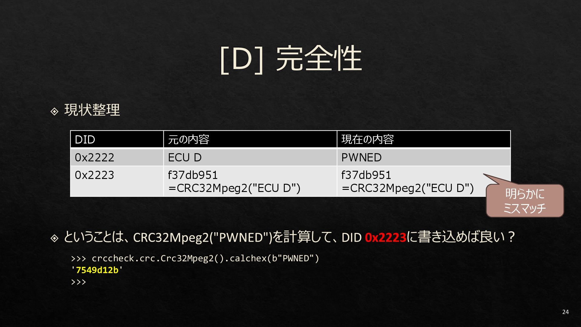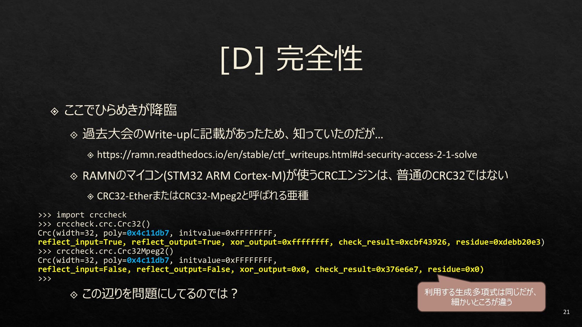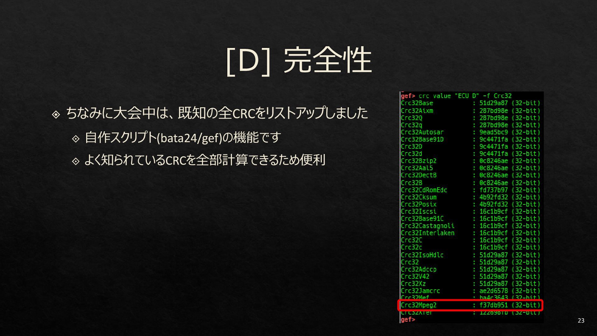 reflect_output=True, xor_output=0xffffffff, check_result=0xcbf43926, residue=0xdebb20e3) >>> crccheck.crc.Crc32Mpeg2() Crc(width=32, poly=0x4c11db7, initvalue=0xFFFFFFFF, reflect_input=False, reflect_output=False, xor_output=0x0, check_result=0x376e6e7, residue=0x0) >>> 利用する生成多項式は同じだが、 細かいところが違う