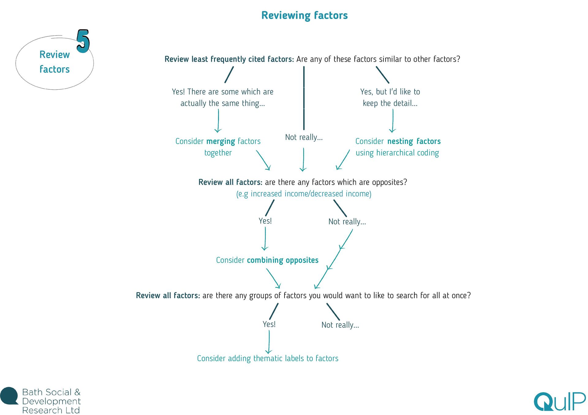 this will really help with your attribution coding! Reviewing factors is an iterative process and shouldn't necessarily be left right to the end, but it is important that you rationalise your codes before you do any analysis! See page 2... Whilst each interview is divided into statements in the app, make sure you read the entire summary transcript for each respondent first - this avoids coding individual statements without understanding the context of the whole conversation. After coding a few interviews it is a good idea to pause and check in with a friend or colleague, to make sure the factor labels make sense to someone other than you! It's also important to brief the commissioner on the types of causal stories emerging and make sure they understand and agree with how factors, and particularly attribution flags, are being used. Coding 'barefoot' basically means to code inductively based on what the respondent has said. This involves reading through each statement (bearing in mind the context of the whole conversation), highlighting pieces of text which contain causal links, and creating factor labels which represent the story! Read ToC Review factors Read whole interview Check in with commissioner Barefoot coding 1 5 2 4 3 to coding QuIP data using Causal Map 5 key steps