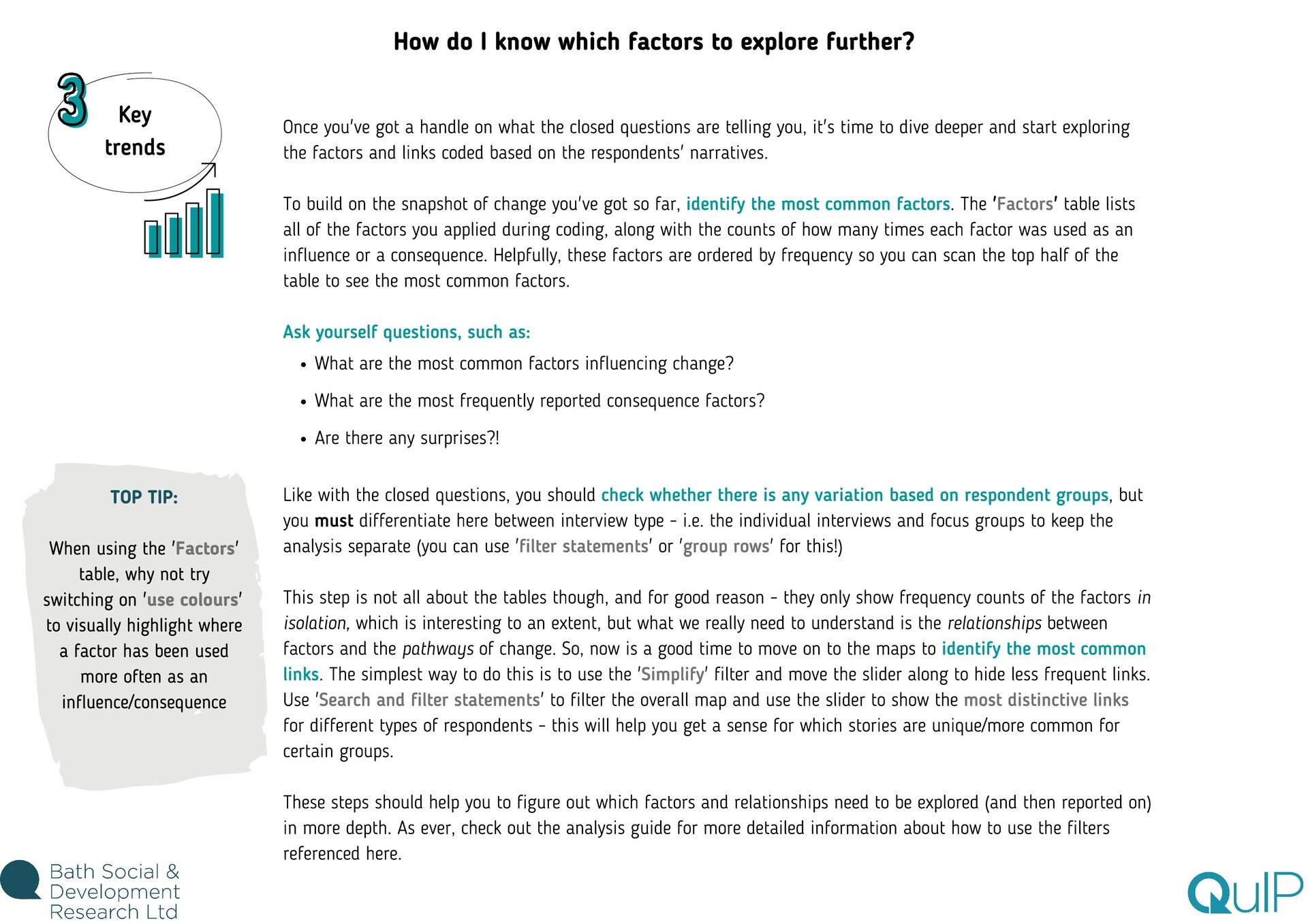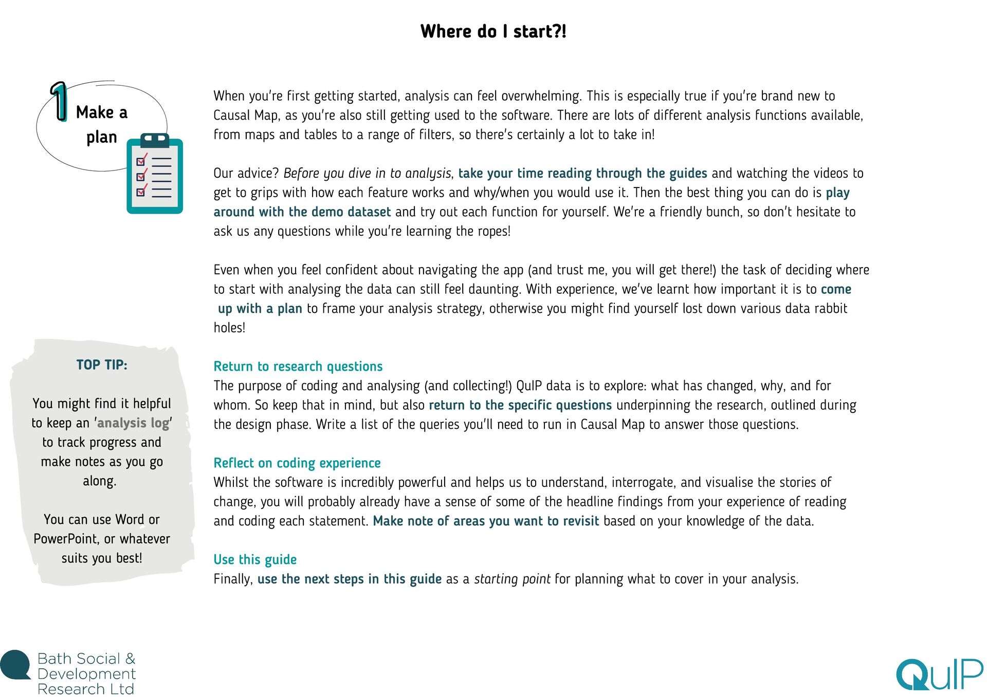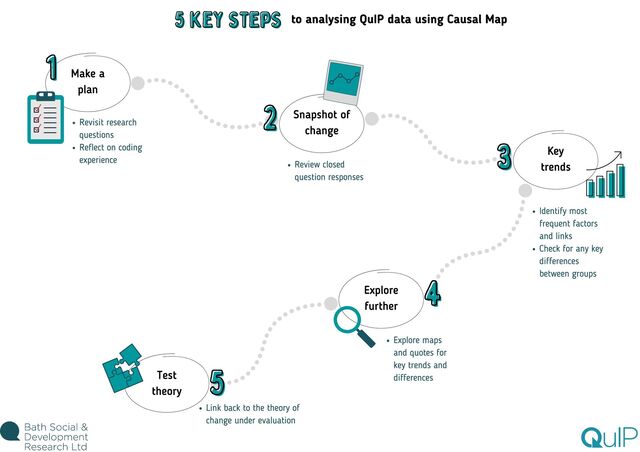 feel overwhelming. This is especially true if you're brand new to Causal Map, as you're also still getting used to the software. There are lots of different analysis functions available, from maps and tables to a range of filters, so there's certainly a lot to take in! Our advice? Before you dive in to analysis, take your time reading through the guides and watching the videos to get to grips with how each feature works and why/when you would use it. Then the best thing you can do is play around with the demo dataset and try out each function for yourself. We're a friendly bunch, so don't hesitate to ask us any questions while you're learning the ropes! Even when you feel confident about navigating the app (and trust me, you will get there!) the task of deciding where to start with analysing the data can still feel daunting. With experience, we've learnt how important it is to come up with a plan to frame your analysis strategy, otherwise you might find yourself lost down various data rabbit holes! Return to research questions The purpose of coding and analysing (and collecting!) QuIP data is to explore: what has changed, why, and for whom. So keep that in mind, but also return to the specific questions underpinning the research, outlined during the design phase. Write a list of the queries you'll need to run in Causal Map to answer those questions. Reflect on coding experience Whilst the software is incredibly powerful and helps us to understand, interrogate, and visualise the stories of change, you will probably already have a sense of some of the headline findings from your experience of reading and coding each statement. Make note of areas you want to revisit based on your knowledge of the data. Use this guide Finally, use the next steps in this guide as a starting point for planning what to cover in your analysis. TOP TIP: You might find it helpful to keep an 'analysis log' to track progress and make notes as you go along. You can use Word or PowerPoint, or whatever suits you best! Where do I start?!