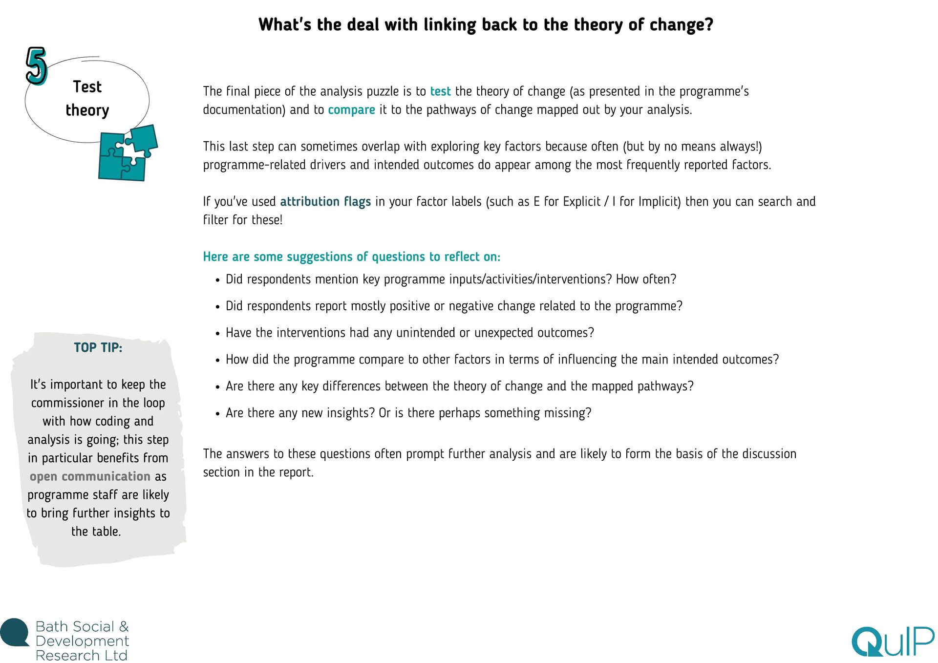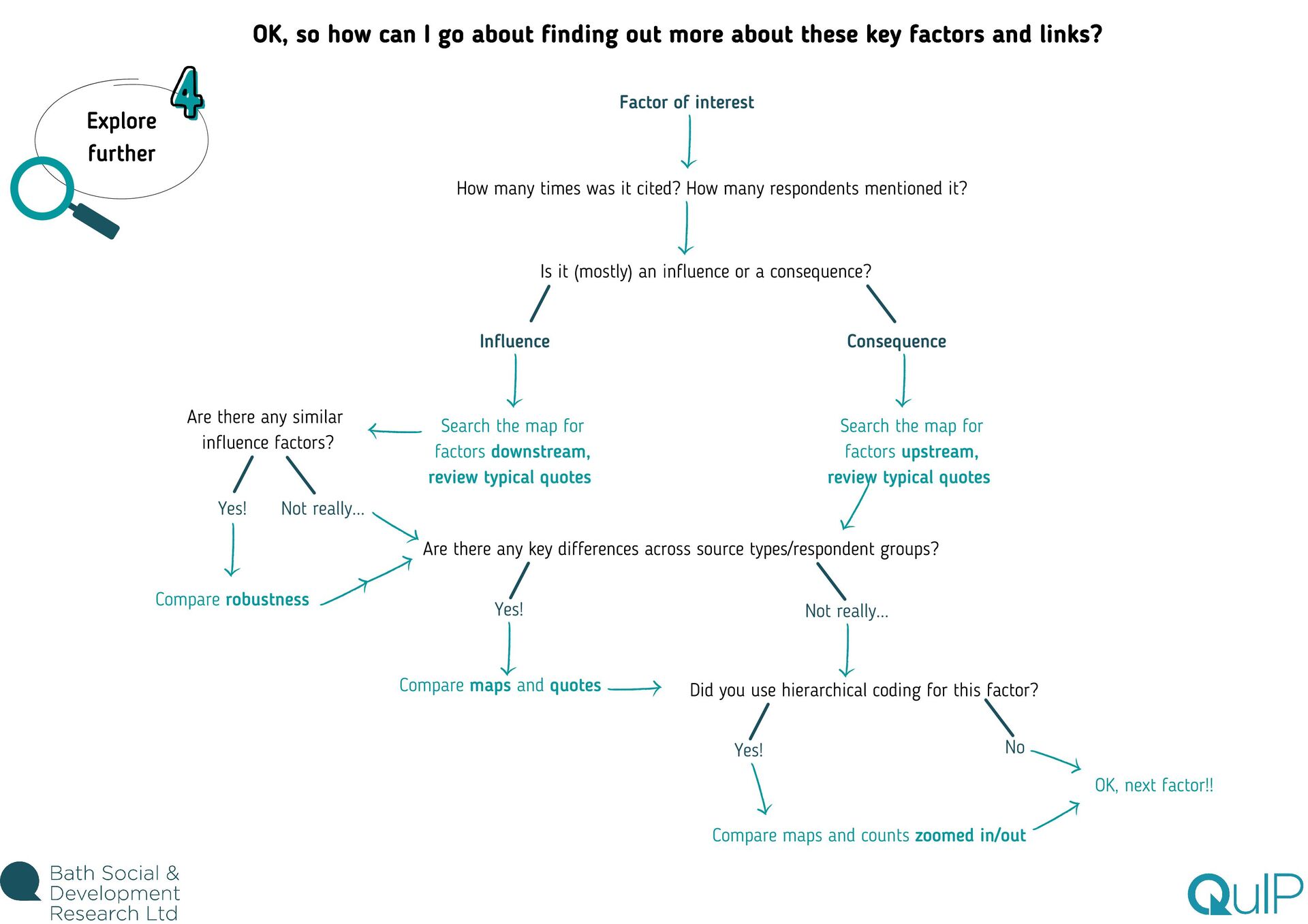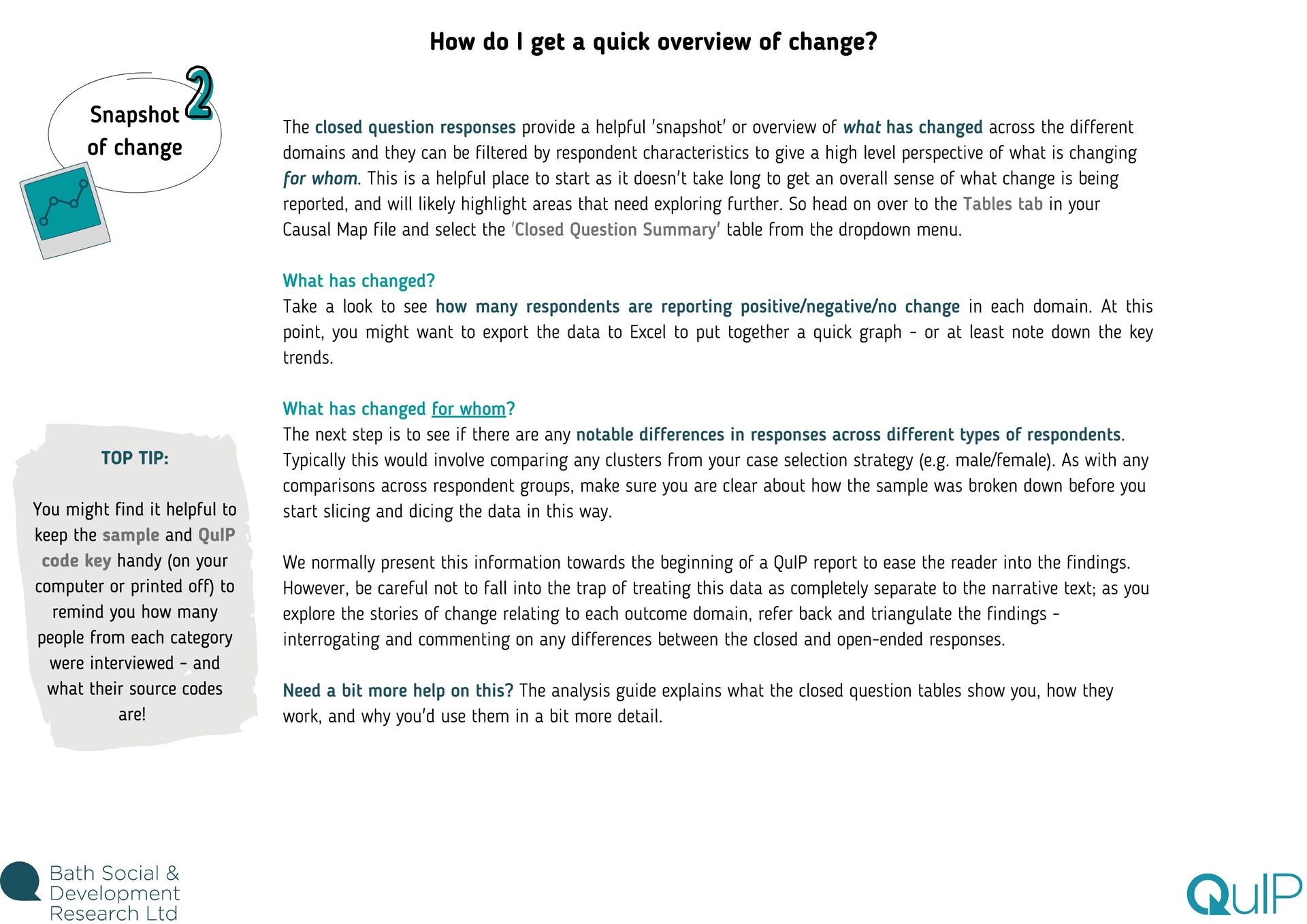 feel overwhelming. This is especially true if you're brand new to Causal Map, as you're also still getting used to the software. There are lots of different analysis functions available, from maps and tables to a range of filters, so there's certainly a lot to take in! Our advice? Before you dive in to analysis, take your time reading through the guides and watching the videos to get to grips with how each feature works and why/when you would use it. Then the best thing you can do is play around with the demo dataset and try out each function for yourself. We're a friendly bunch, so don't hesitate to ask us any questions while you're learning the ropes! Even when you feel confident about navigating the app (and trust me, you will get there!) the task of deciding where to start with analysing the data can still feel daunting. With experience, we've learnt how important it is to come up with a plan to frame your analysis strategy, otherwise you might find yourself lost down various data rabbit holes! Return to research questions The purpose of coding and analysing (and collecting!) QuIP data is to explore: what has changed, why, and for whom. So keep that in mind, but also return to the specific questions underpinning the research, outlined during the design phase. Write a list of the queries you'll need to run in Causal Map to answer those questions. Reflect on coding experience Whilst the software is incredibly powerful and helps us to understand, interrogate, and visualise the stories of change, you will probably already have a sense of some of the headline findings from your experience of reading and coding each statement. Make note of areas you want to revisit based on your knowledge of the data. Use this guide Finally, use the next steps in this guide as a starting point for planning what to cover in your analysis. TOP TIP: You might find it helpful to keep an 'analysis log' to track progress and make notes as you go along. You can use Word or PowerPoint, or whatever suits you best! Where do I start?!