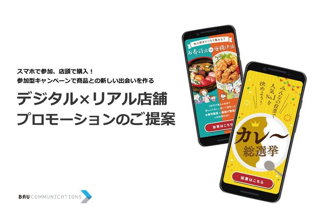 という割合もわかりやすく、中間発表も可能。 たとえば 肉 VS 魚 など、指示が多かった方に割引クーポン配布(orセール実施) ◦◦ が何%、△△が何% という割合が わかりやすく、中間発表も可能なため 売り場を盛り上げます。 例 ここがポイント! ★ 肉VS魚 など大きなくくりでの対決から 甘党 VS 辛党などチーム戦も可能。 売りたい部門に合わせて企画します。 ★ 秋の週末どっちで集まる? 寿司派vs唐揚げ派 3世代が集まる食卓で 楽しんでほしい想いで開発した 「寿司」惣菜と「唐揚げ」惣菜の 対決を実施! ※期間限定商品の開発 惣菜購入後、食べた感想を応募。 指示が多かった方は後日 割引クーポンを配布 Copyright © BAU COMMUNICATIONS Inc. 5 企画例:VS企画