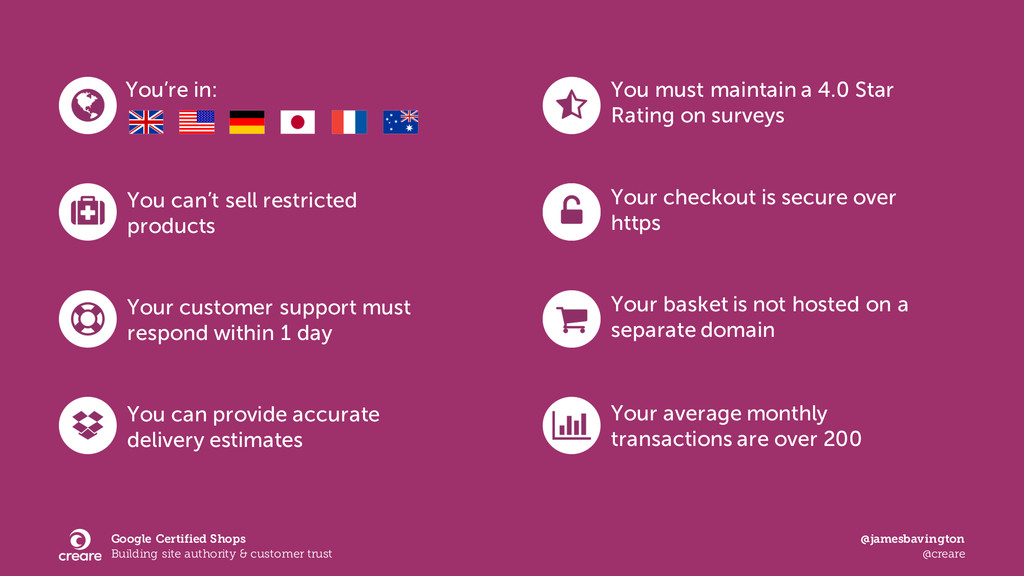 Google’s Trusted Stores programme is a free initiative to help online merchants build trust with their prospective customers by carrying the ‘Google Trusted Store’ badge. Having successfully certified many ecommerce clients at Creare, I’ll be explaining what the programme is, which businesses are eligible and also how the technical integration works using real-world examples throughout.