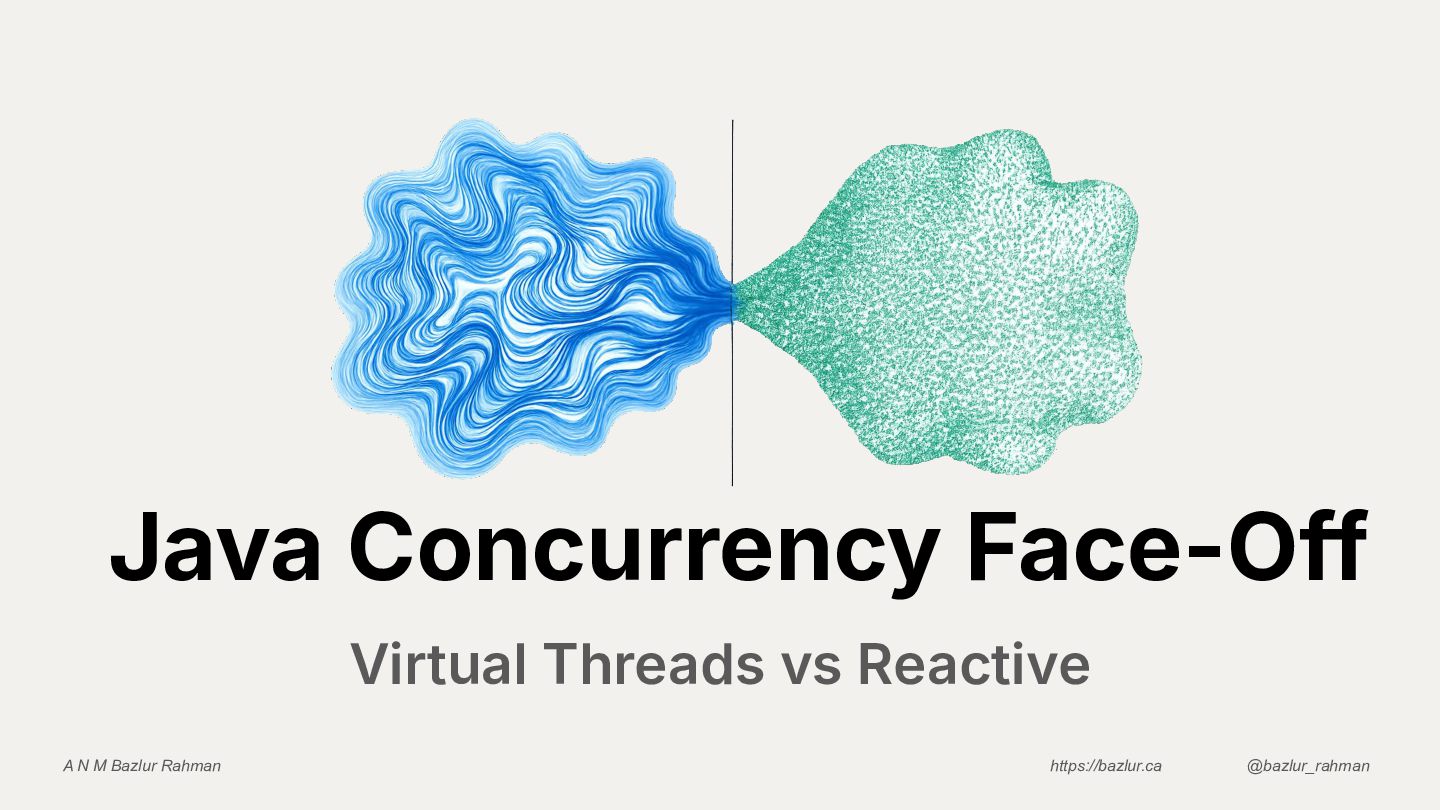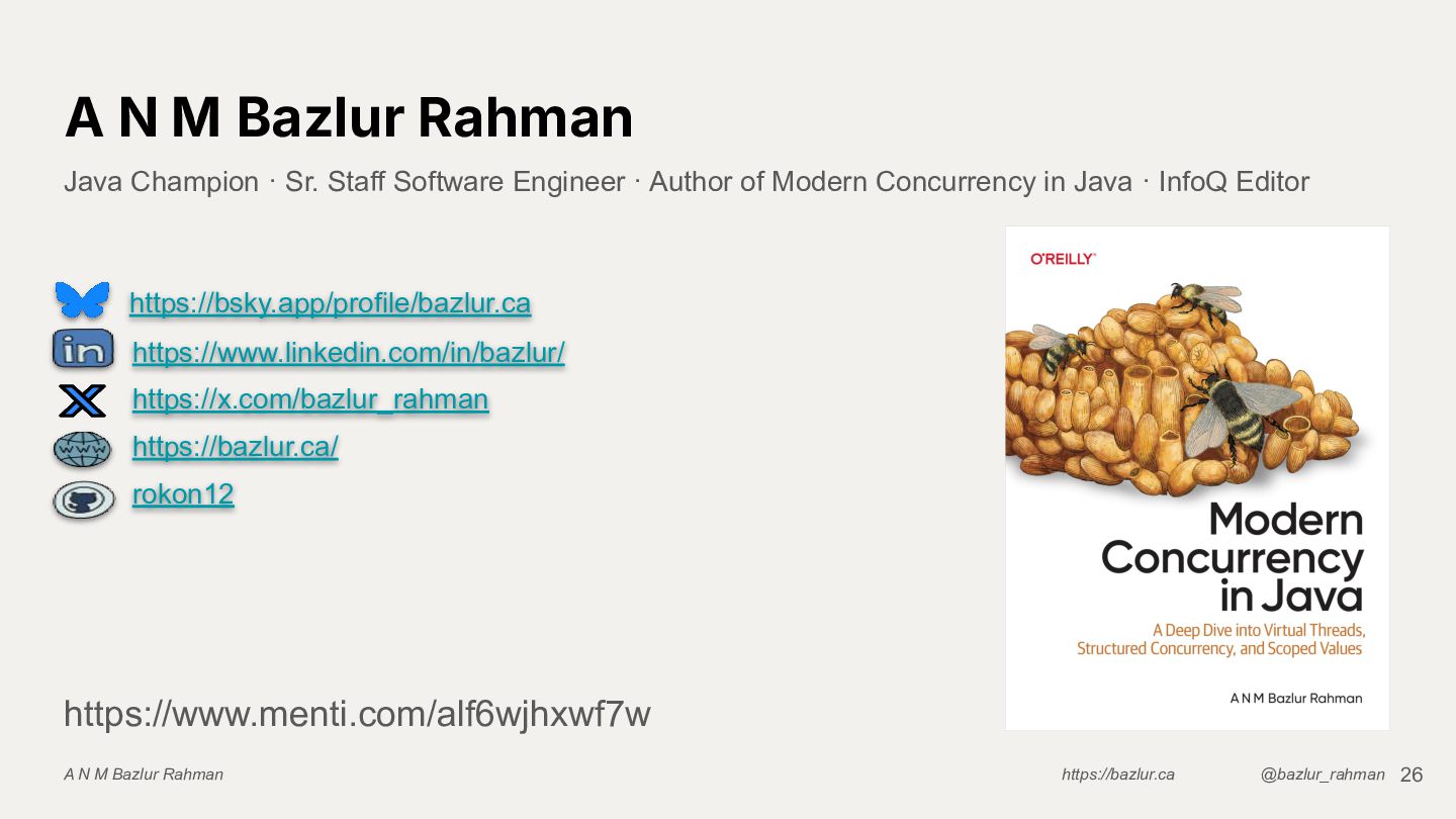 Bazlur Rahman 26 Java Champion · Sr. Staff Software Engineer · Author of Modern Concurrency in Java · InfoQ Editor https://x.com/bazlur_rahman rokon12 https://www.linkedin.com/in/bazlur/ https://bazlur.ca/ https://bsky.app/profile/bazlur.ca https://www.menti.com/alf6wjhxwf7w