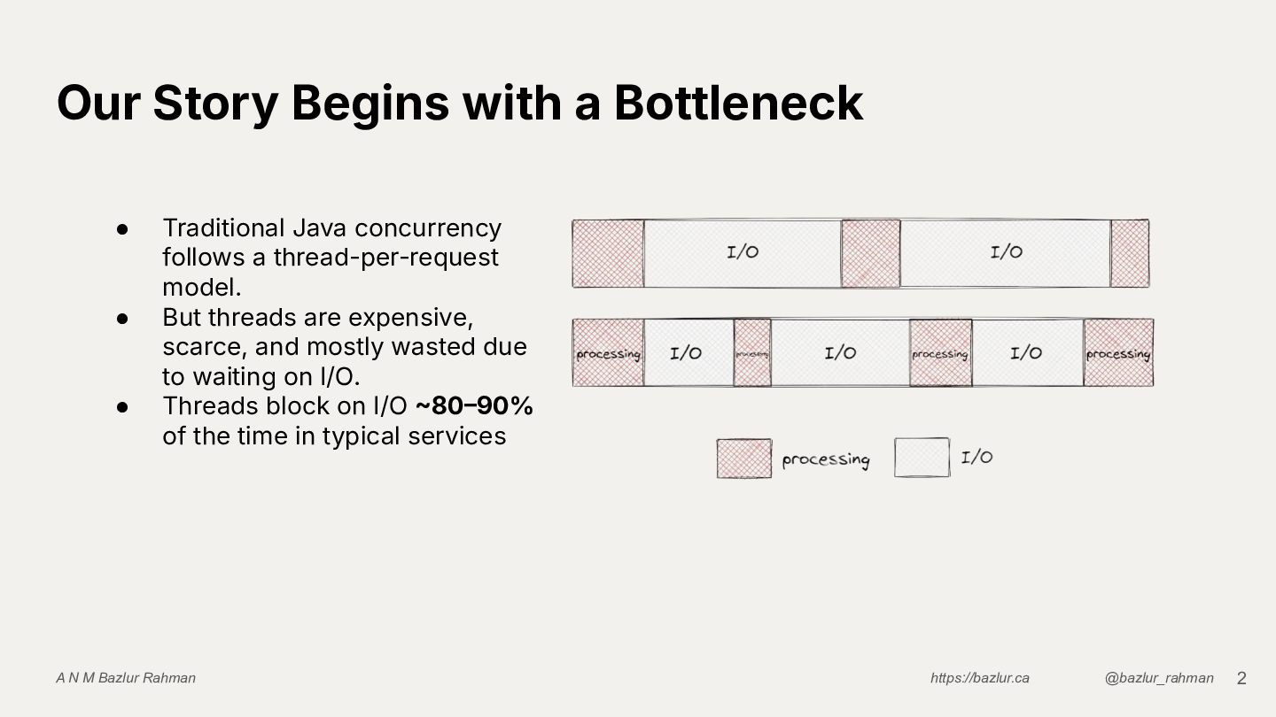 with a Bottleneck 2 • Traditional Java concurrency follows a thread-per-request model. • But threads are expensive, scarce, and mostly wasted due to waiting on I/O. • Threads block on I/O 8090% of the time in typical services