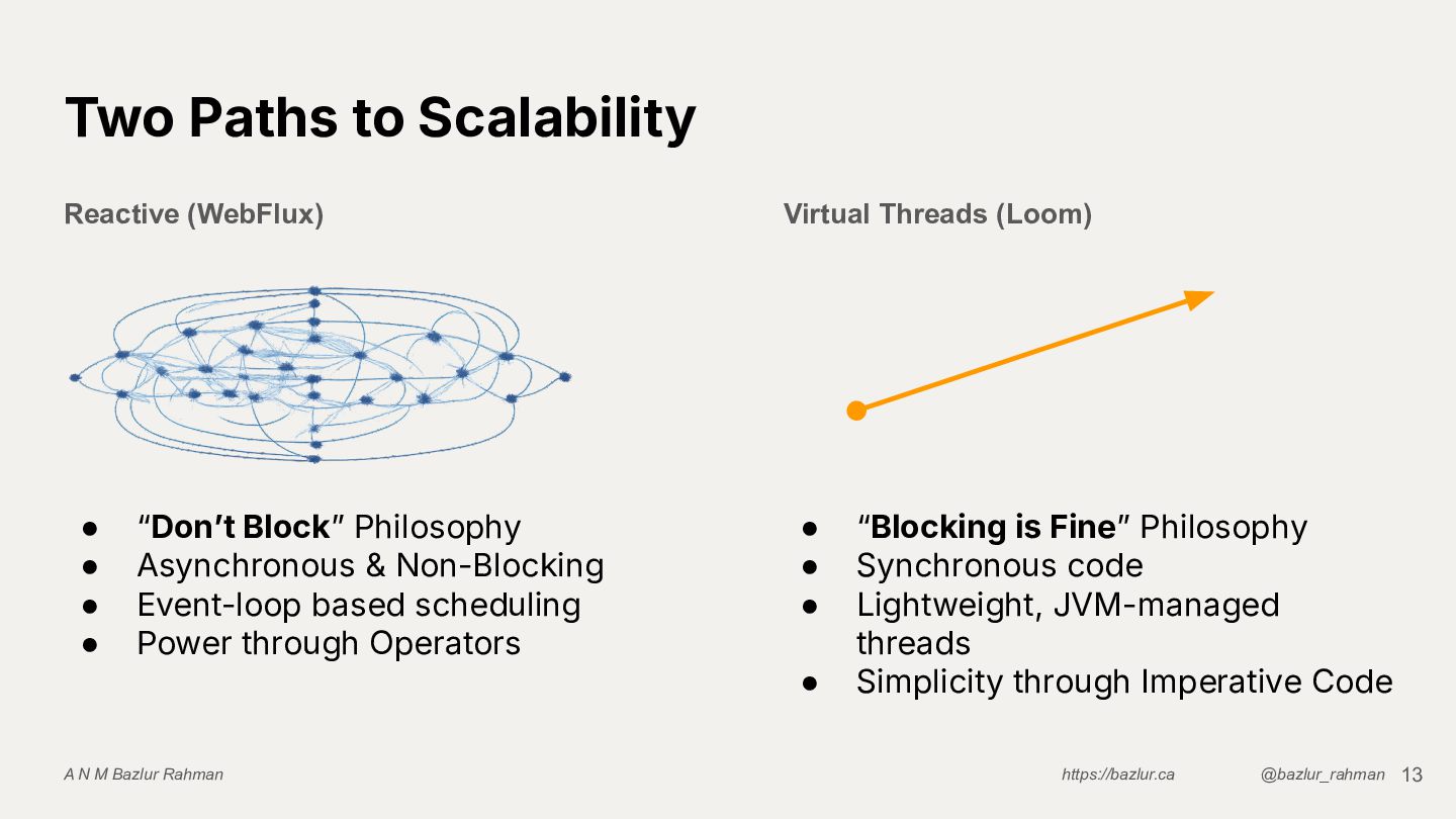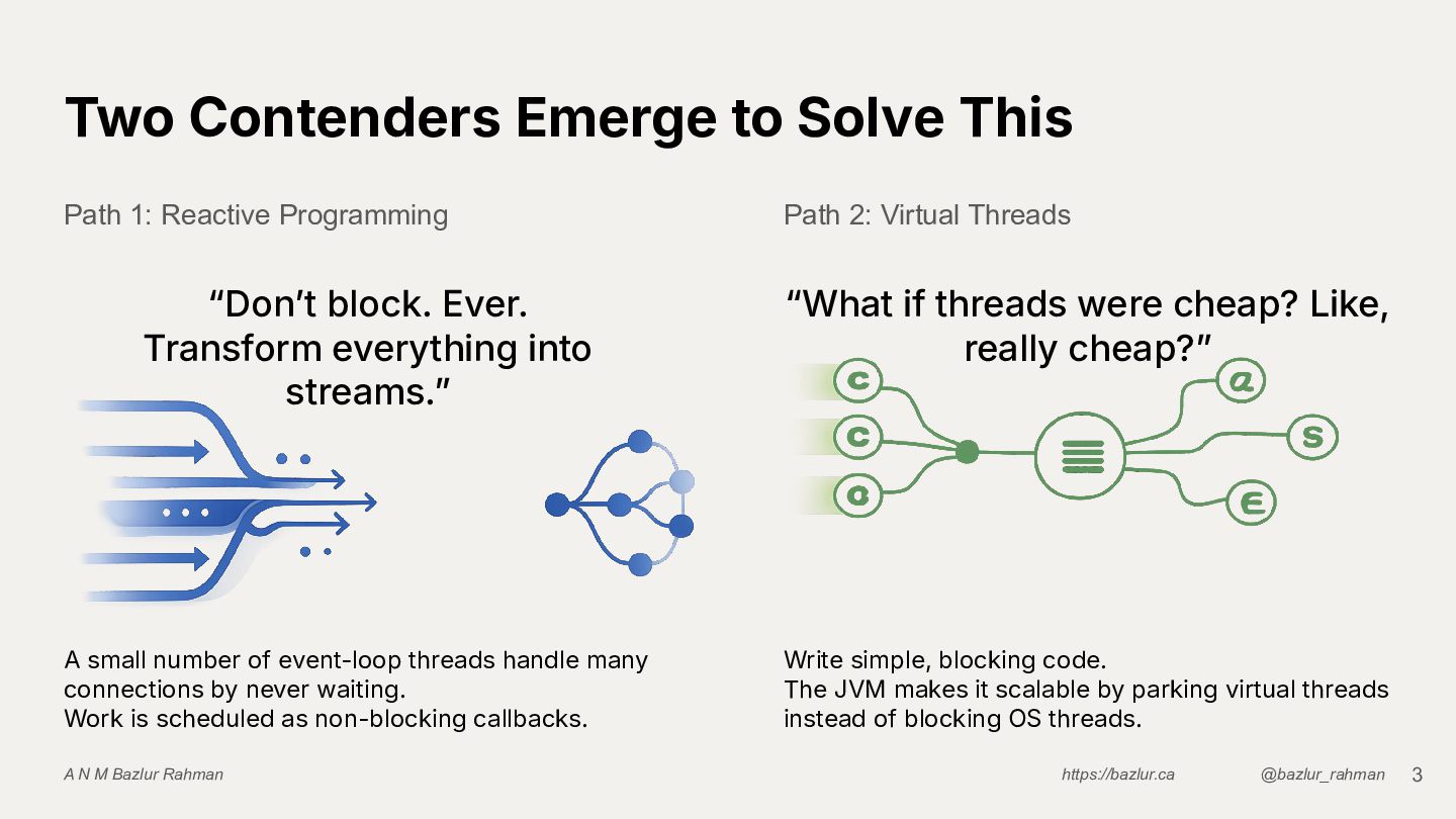 to Solve This Path 1: Reactive Programming 3 Path 2: Virtual Threads “Donʼt block. Ever. Transform everything into streams.ˮ “What if threads were cheap? Like, really cheap?ˮ A small number of event-loop threads handle many connections by never waiting. Work is scheduled as non-blocking callbacks. Write simple, blocking code. The JVM makes it scalable by parking virtual threads instead of blocking OS threads.