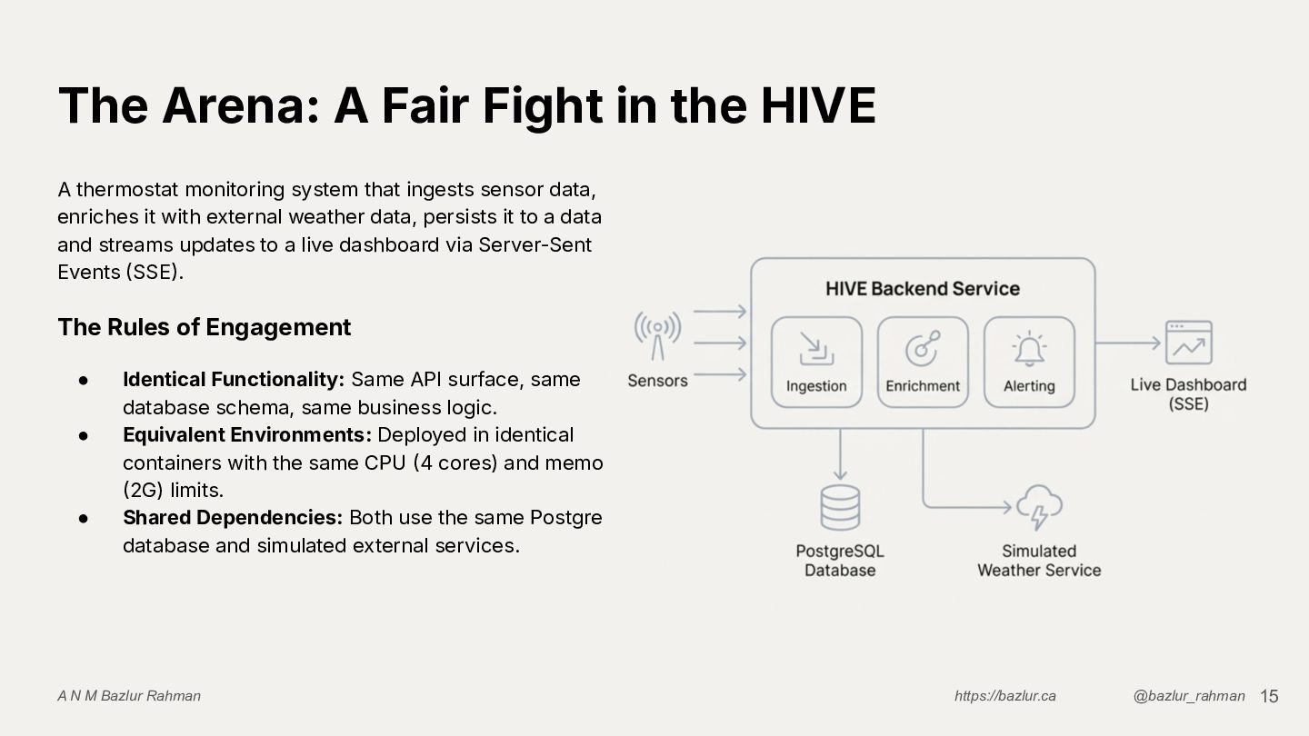 Fair Fight in the HIVE A thermostat monitoring system that ingests sensor data, enriches it with external weather data, persists it to a database, and streams updates to a live dashboard via Server-Sent Events SSE. The Rules of Engagement • Identical Functionality: Same API surface, same database schema, same business logic. • Equivalent Environments: Deployed in identical containers with the same CPU 4 cores) and memory 2G) limits. • Shared Dependencies: Both use the same PostgreSQL database and simulated external services. 15