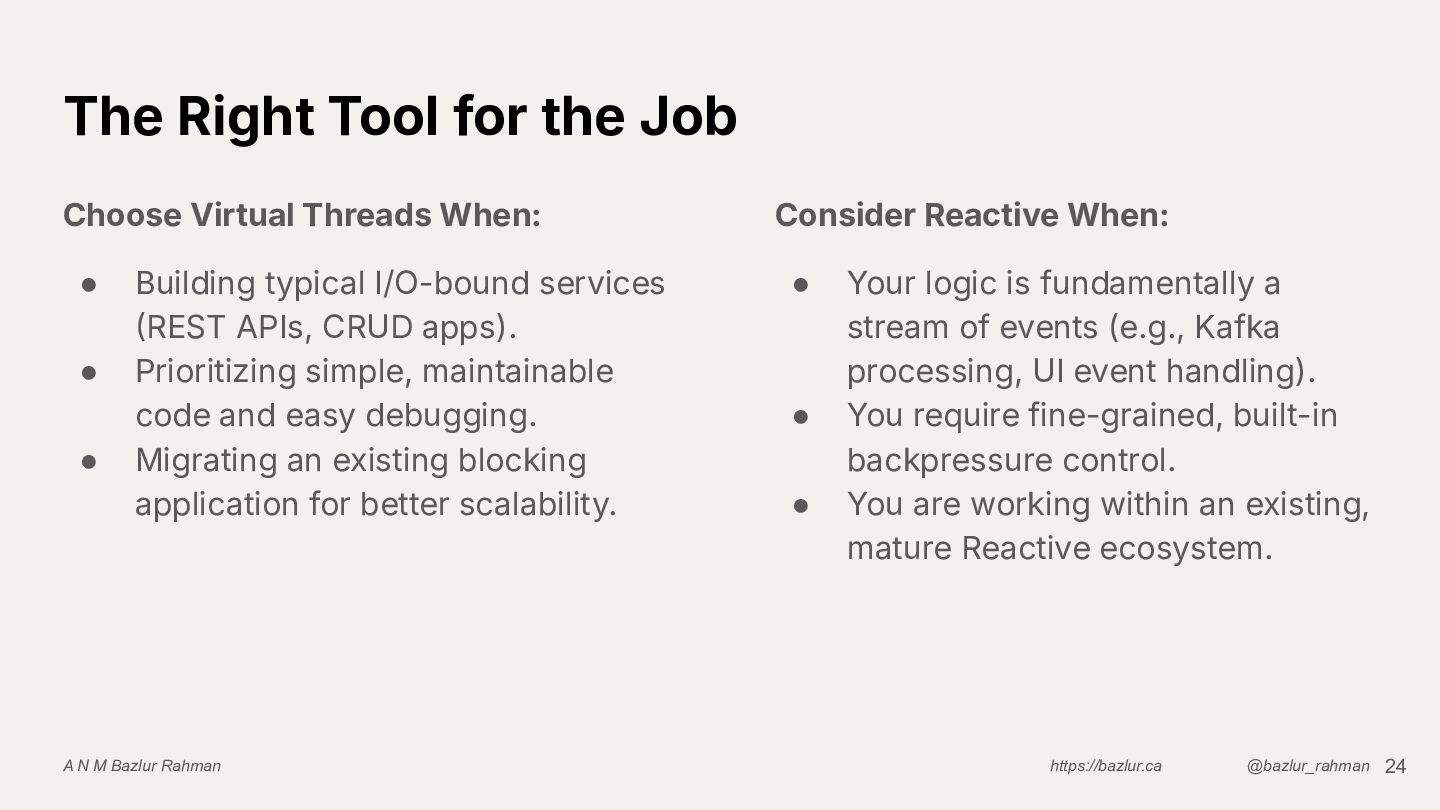 for the Job Choose Virtual Threads When: • Building typical I/O-bound services REST APIs, CRUD apps). • Prioritizing simple, maintainable code and easy debugging. • Migrating an existing blocking application for better scalability. 24 Consider Reactive When: • Your logic is fundamentally a stream of events (e.g., Kafka processing, UI event handling). • You require fine-grained, built-in backpressure control. • You are working within an existing, mature Reactive ecosystem.