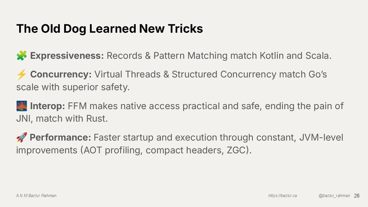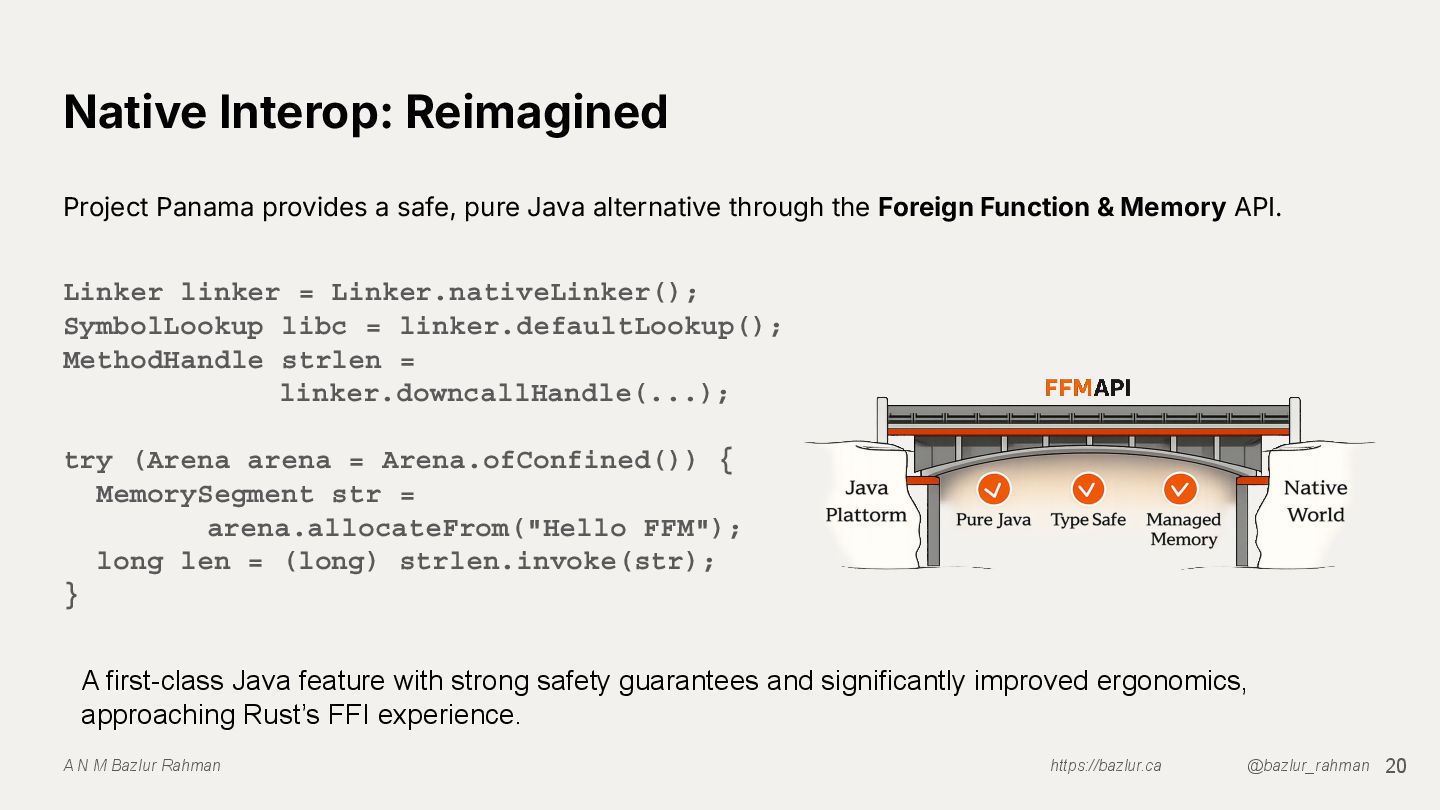 - Foreign Function & Memory API as a modern, safer alternative to JNI, rivalling Rust’s FFI