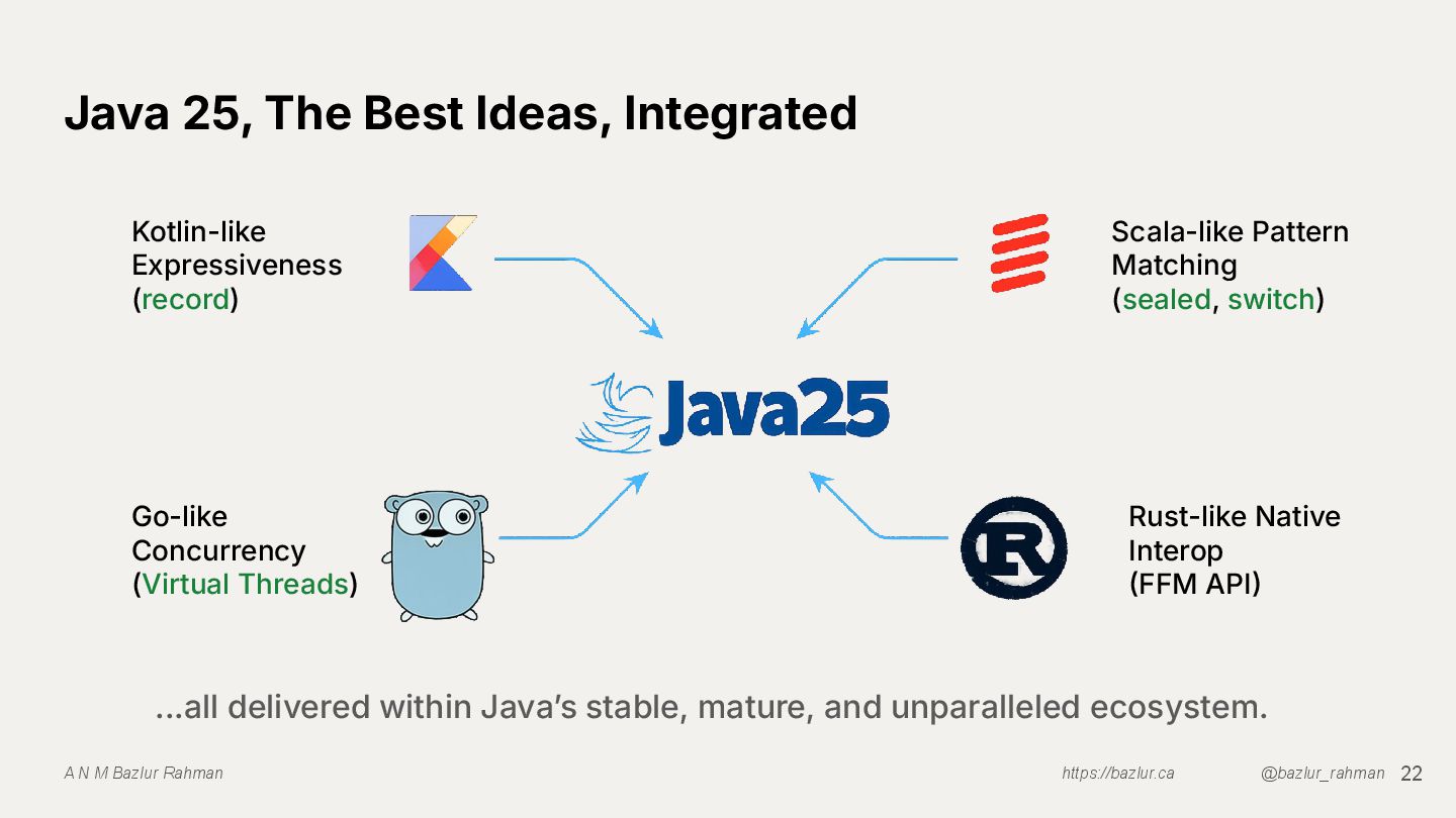 Modern Java has evolved into a powerful, expressive language by quietly adopting the best ideas from its peers without compromising its core principles of readability, safety, and performance. In this talk, we'll explore how Java 25 now competes head-to-head with languages like Kotlin, Scala, Rust, and Go.