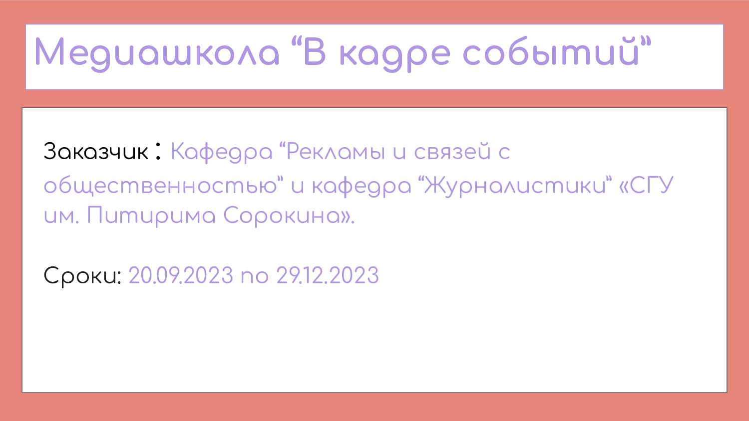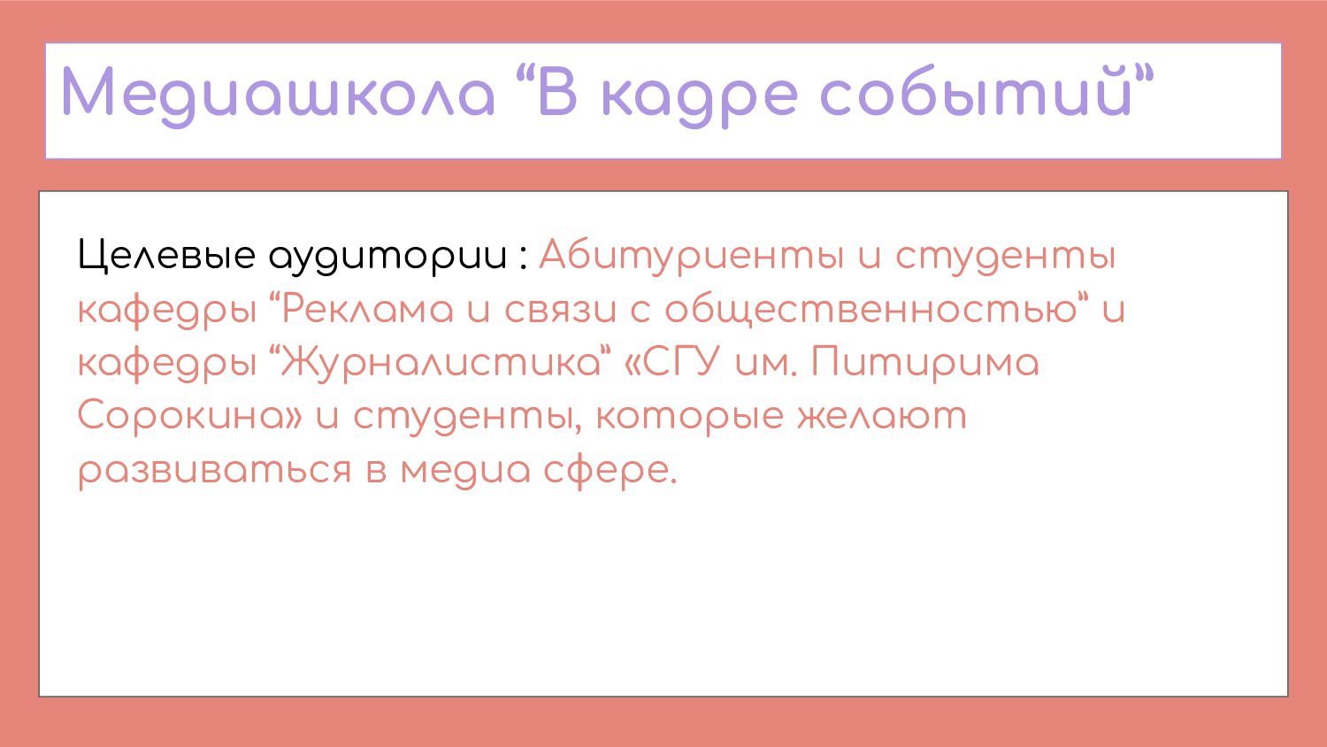 Абитуриенты и студенты кафедры “Реклама и связи с общественностью” и кафедры “Журналистика” «СГУ им. Питирима Сорокина» и студенты, которые желают развиваться в медиа сфере.