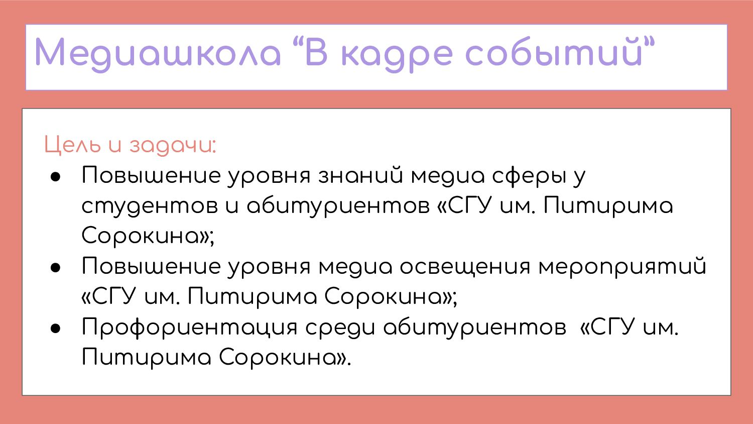 • Повышение уровня знаний медиа сферы у студентов и абитуриентов «СГУ им. Питирима Сорокина»; • Повышение уровня медиа освещения мероприятий «СГУ им. Питирима Сорокина»; • Профориентация среди абитуриентов «СГУ им. Питирима Сорокина».
