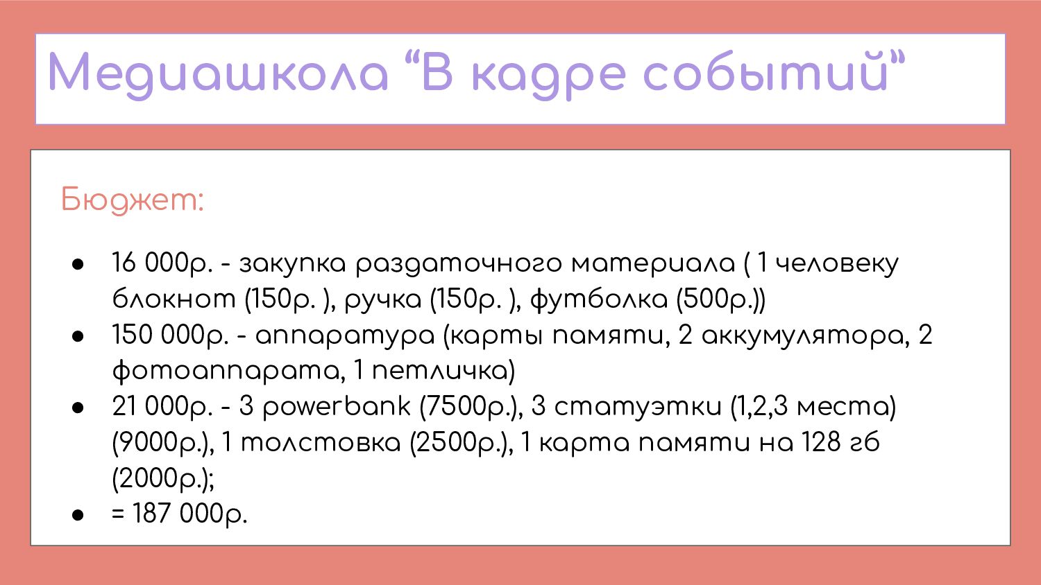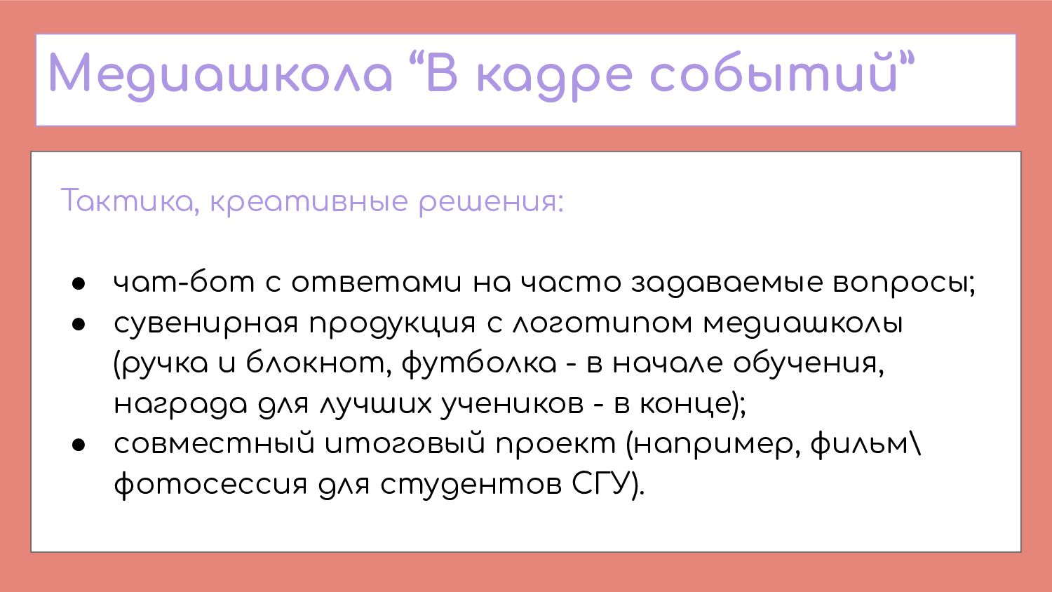 • чат-бот с ответами на часто задаваемые вопросы; • сувенирная продукция с логотипом медиашколы (ручка и блокнот, футболка - в начале обучения, награда для лучших учеников - в конце); • совместный итоговый проект (например, фильм\ фотосессия для студентов СГУ).