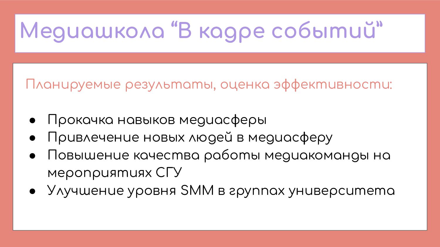 эффективности: • Прокачка навыков медиасферы • Привлечение новых людей в медиасферу • Повышение качества работы медиакоманды на мероприятиях СГУ • Улучшение уровня SMM в группах университета