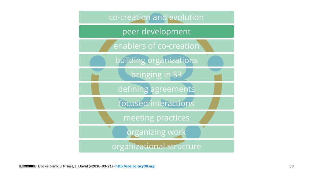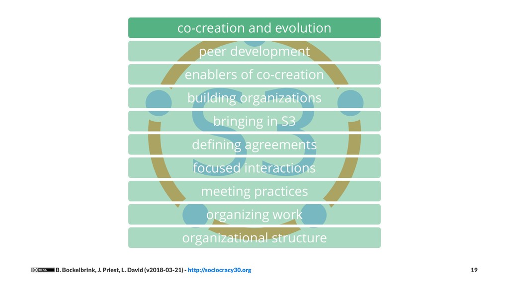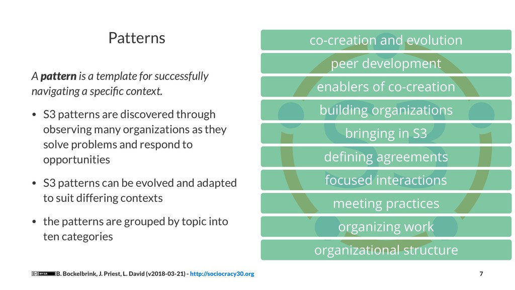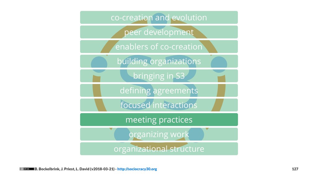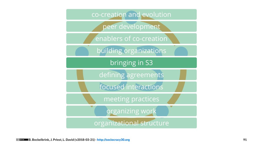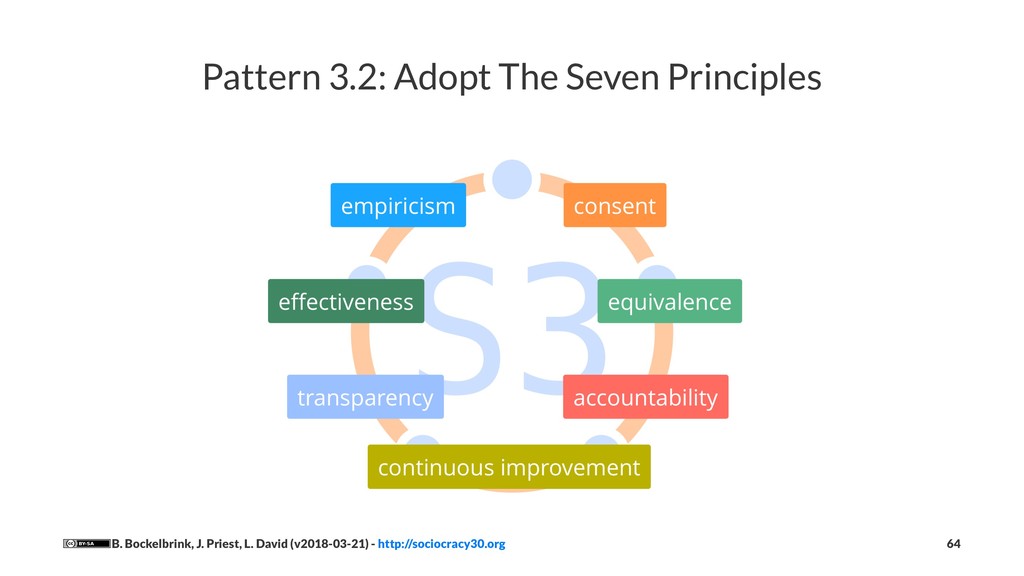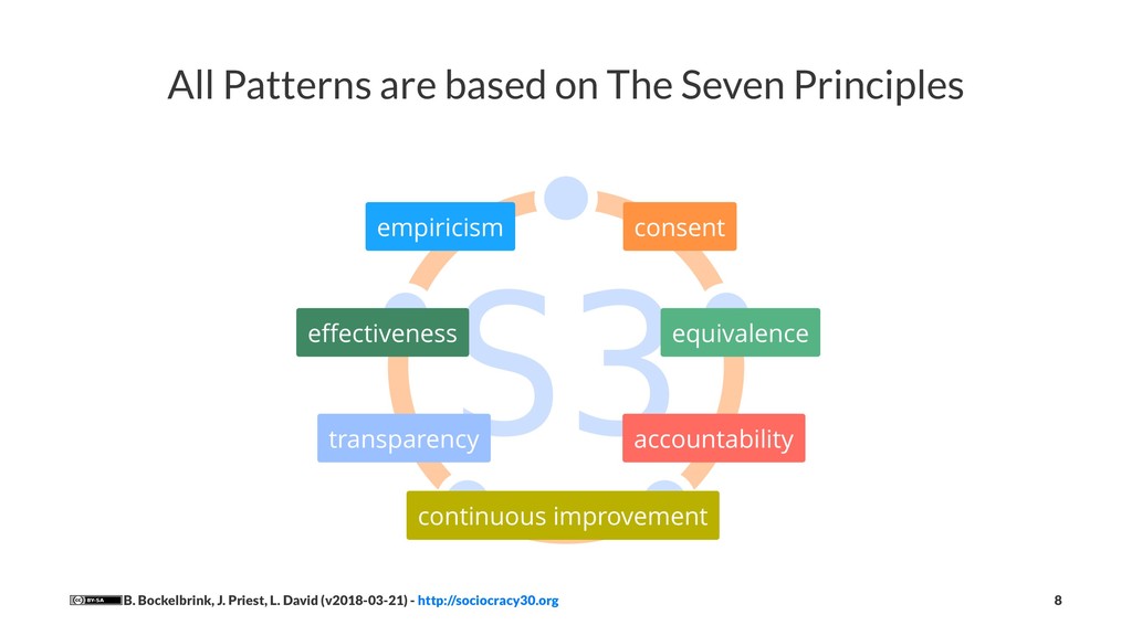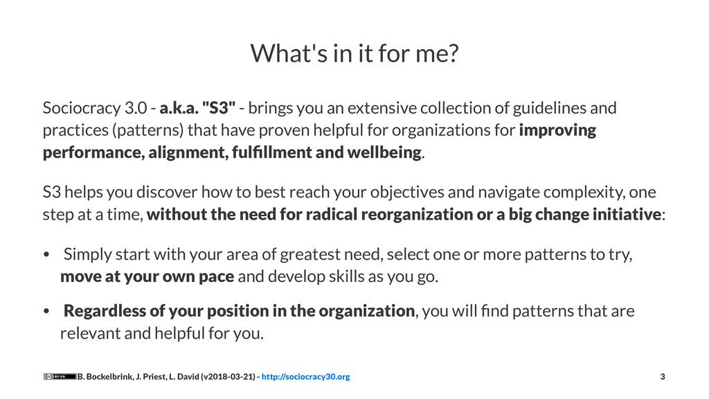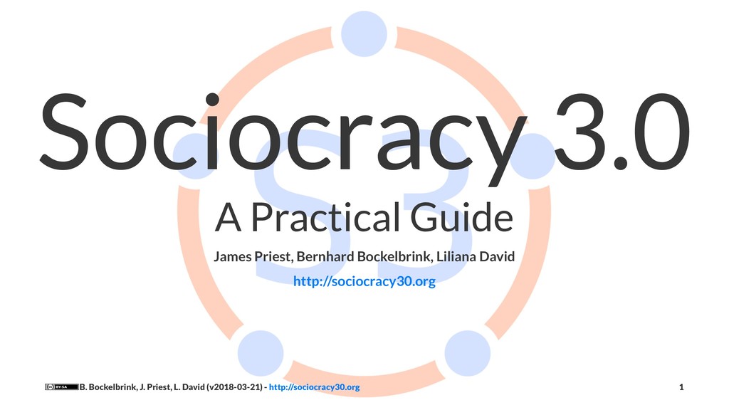 Sociocracy 3.0 (a.k.a. S3) - brings you an extensive collection of guidelines and practices (patterns) that have proven helpful for organizations for improving performance, alignment, fulfillment and wellbeing.