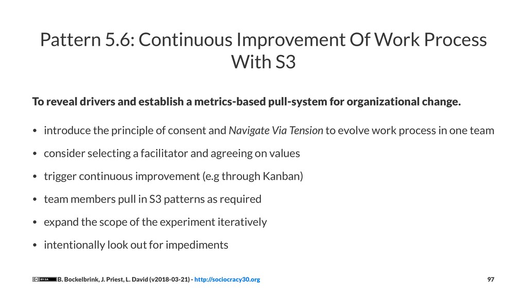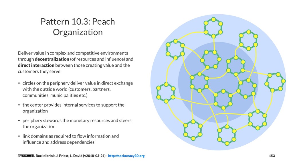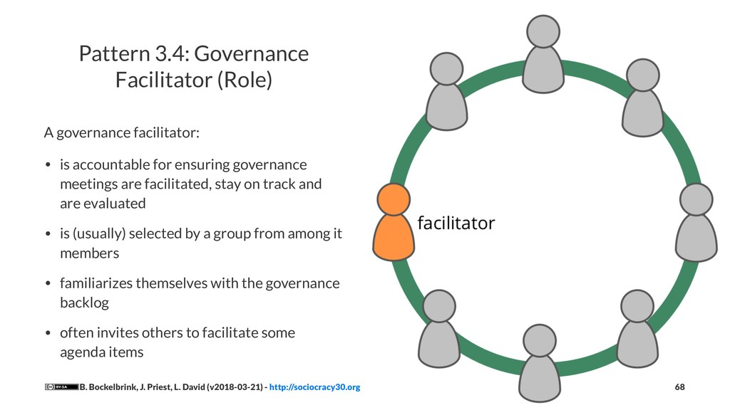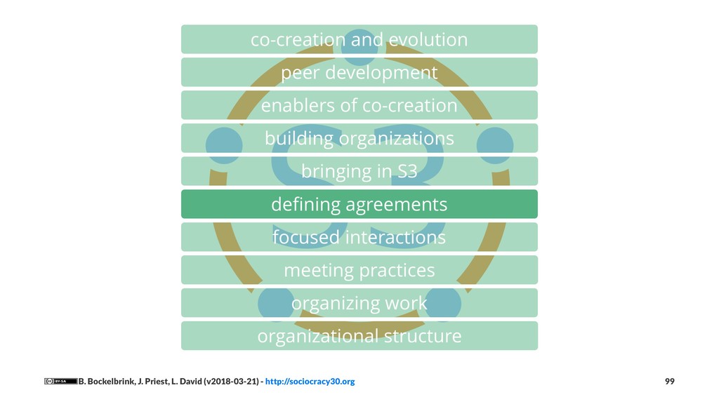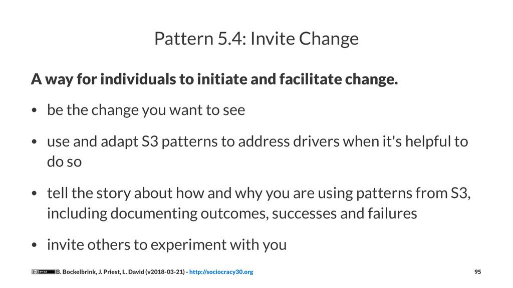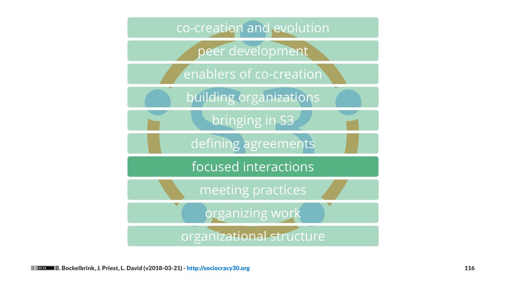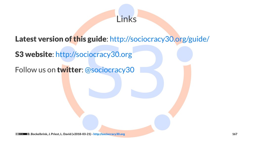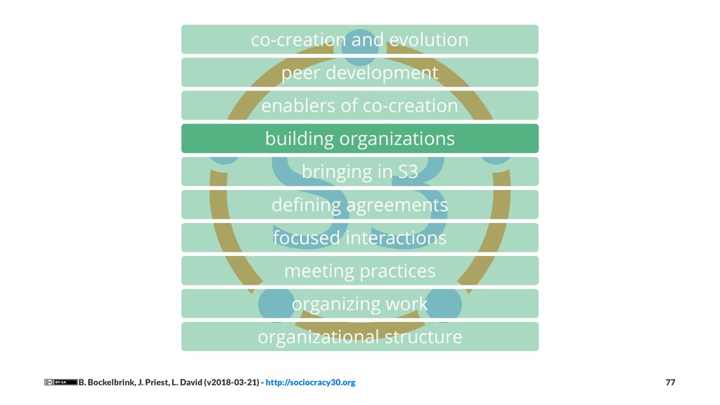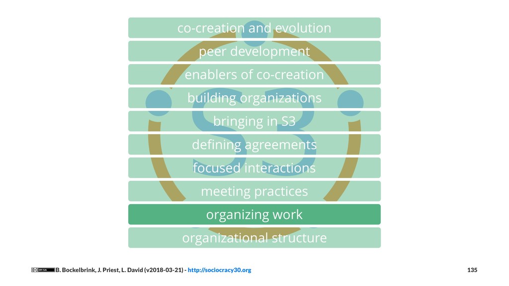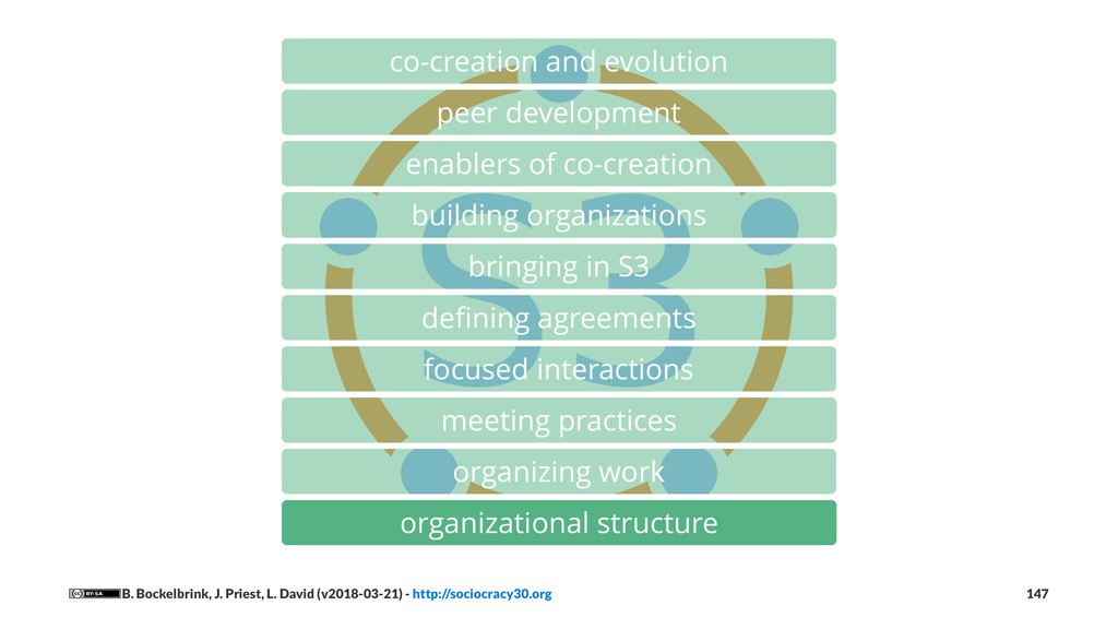 Sociocracy 3.0 (a.k.a. S3) - brings you an extensive collection of guidelines and practices (patterns) that have proven helpful for organizations for improving performance, alignment, fulfillment and wellbeing.