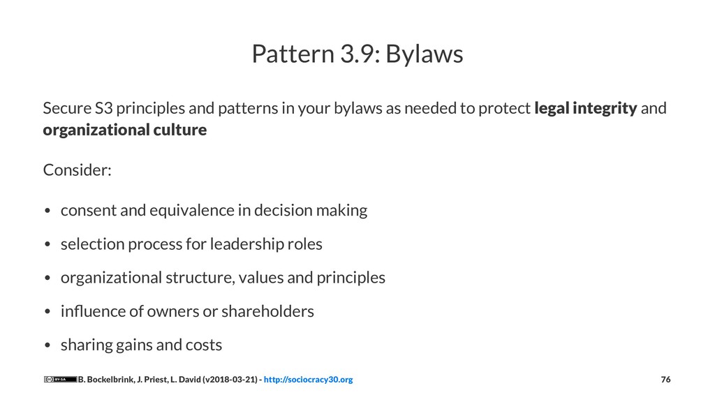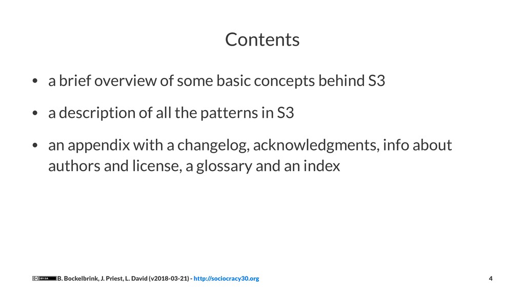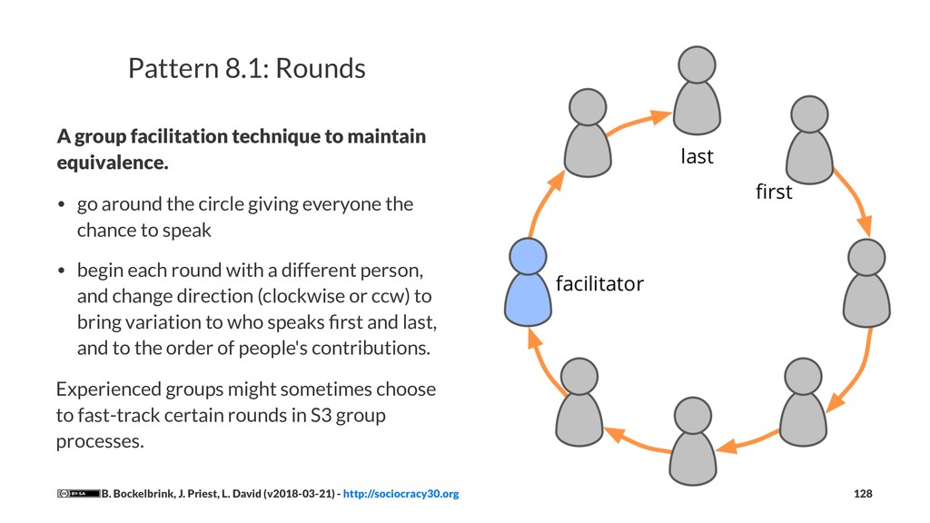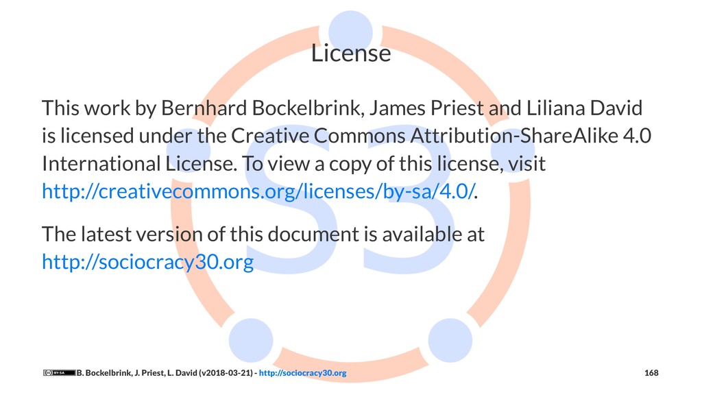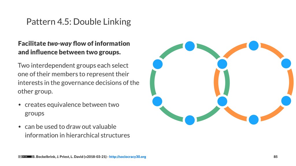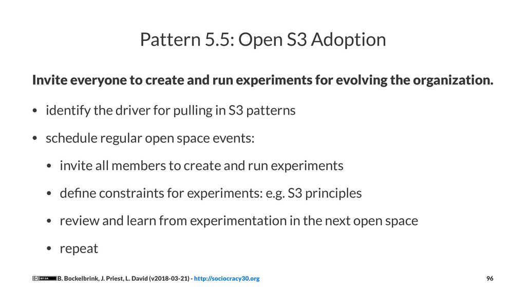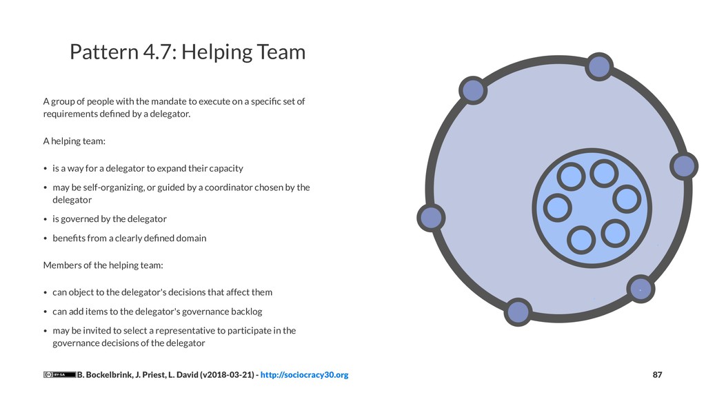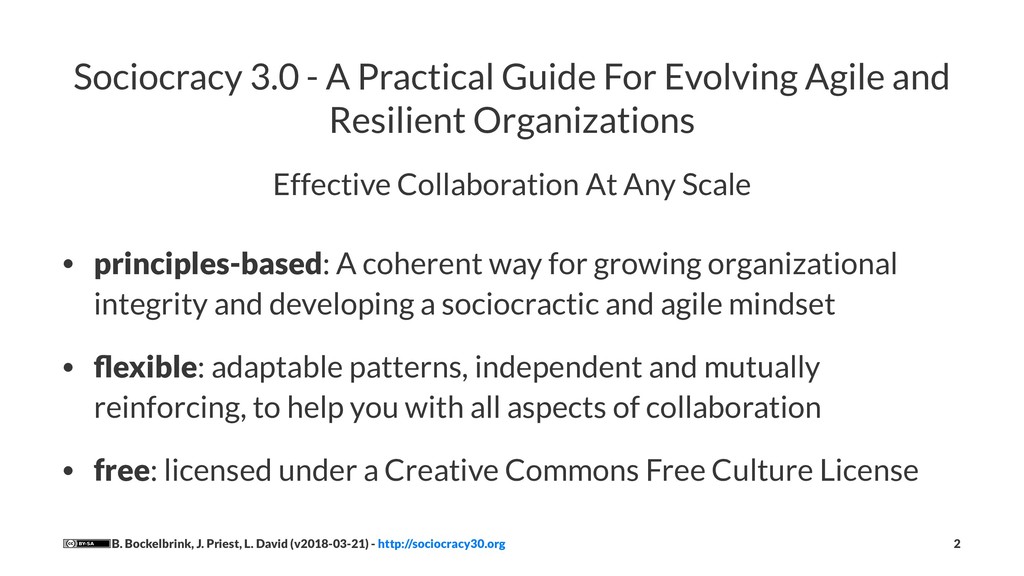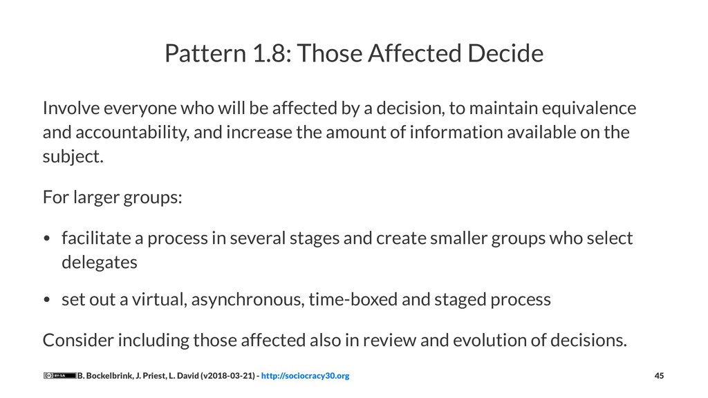 Sociocracy 3.0 (a.k.a. S3) - brings you an extensive collection of guidelines and practices (patterns) that have proven helpful for organizations for improving performance, alignment, fulfillment and wellbeing.