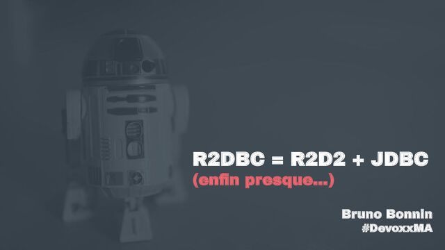 pour standardiser l’accès aux bases de données relationnelles en mode réactif - Il y a aussi des transactions, du batch, des entity callbacks, de l’observability, … - Support de la communauté (clients, drivers, …) - On peut faire du R2DBC sans aucun autre framework, mais ça va être un peu roots :) Mais il reste du boulot ! - Des frameworks en cours de mises à jour (Liquibase, …) - Spring : pas de support des relations dans les entités :(