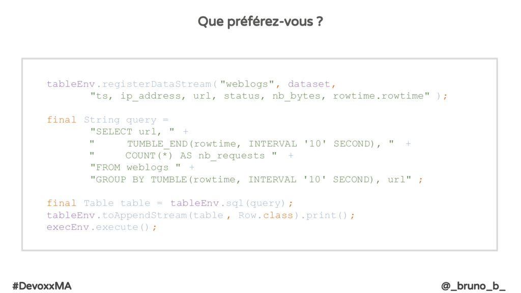 d’autres possibilités comme les jointures entre streams, update/delete/insert, ... • Détails: https://calcite.apache.org/docs/stream.html Tout n’est pas implémenté ! Mais le but est de faire avancer le standard SQL. Le SQL permet de réunir tous les acteurs autour d’un outil commun pour traiter les données, streams ou pas !