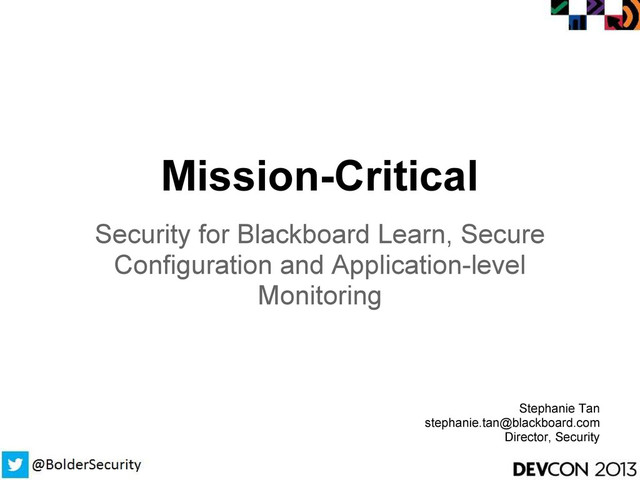 What's the big picture for Security Controls in Blackboard Learn within the Security Ecosystem? And how do the security topics in this conference fit into this picture? Stephanie Tan will highlight new and recently changed Security Controls in Blackboard Learn with live demos and software upgrade considerations, best practices for a secure Blackboard Learn configuration, and how to leverage new security logs for forensics and situational awareness. She will discuss how Blackboard Learn's Security Program has evolved since she first came to BbWorld in 2011. Walk away knowing how to fine-tune your Blackboard Learn platform, whether self-hosted or managed hosted, in order to protect it from security threats appropriate to your organization.